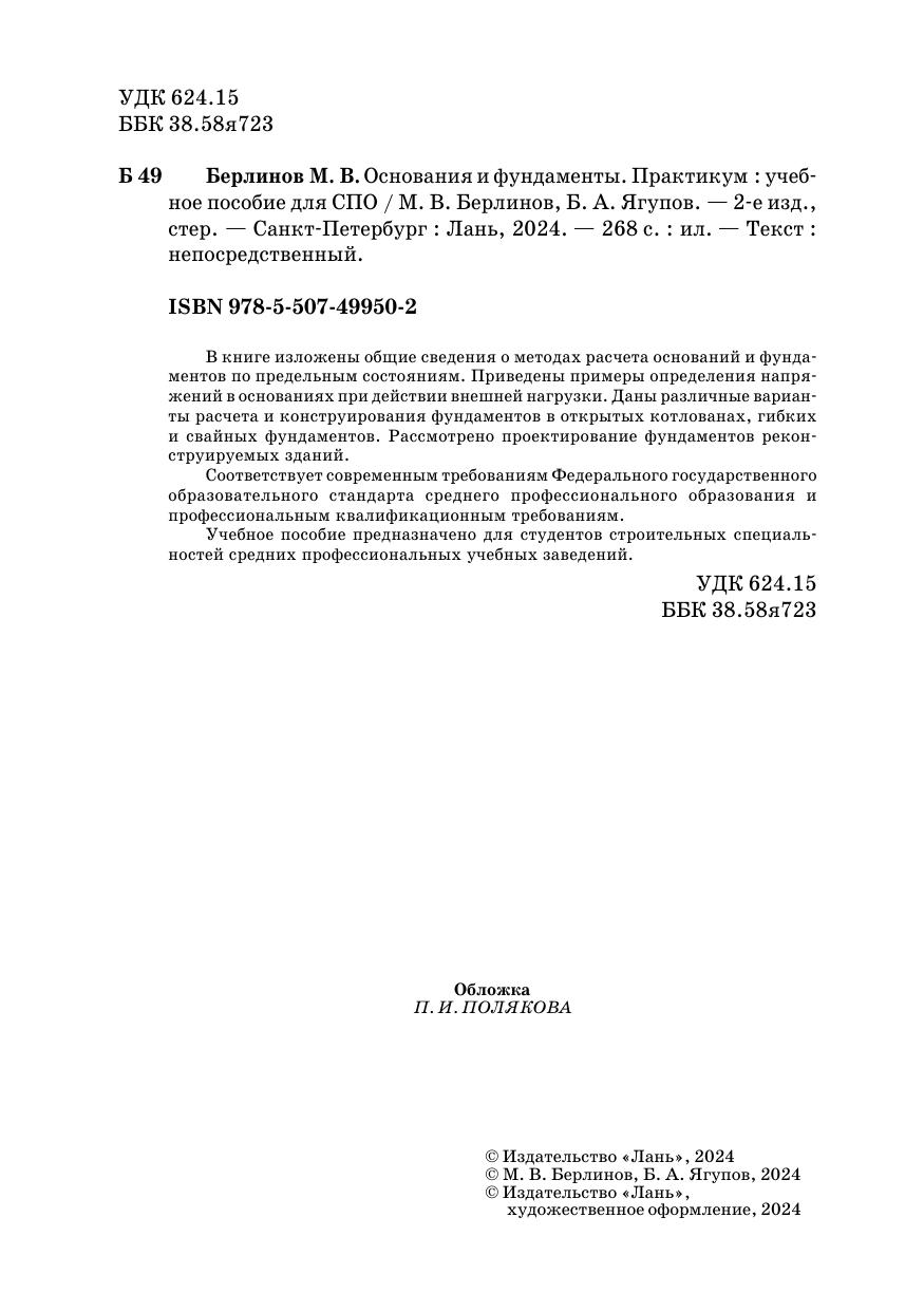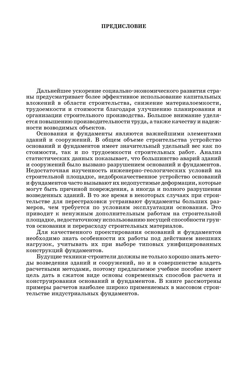 В книге изложены общие сведения о методах расчета оснований и фундаментов по предельным состояниям. Приведены примеры определения напряжений в основаниях при действии внешней нагрузки. Даны различные варианты расчета и конструирования фундаментов в открытых котлованах, гибких и свайных фундаментов. Рассмотрено проектирование фундаментов реконструируемых зданий. Учебное пособие предназначено для студентов строительных специальностей средних профессиональных учебных заведений. Соответствует современным требованиям Федерального государственного образовательного стандарта среднего профессионального образования и профессиональным квалификационным требованиям.