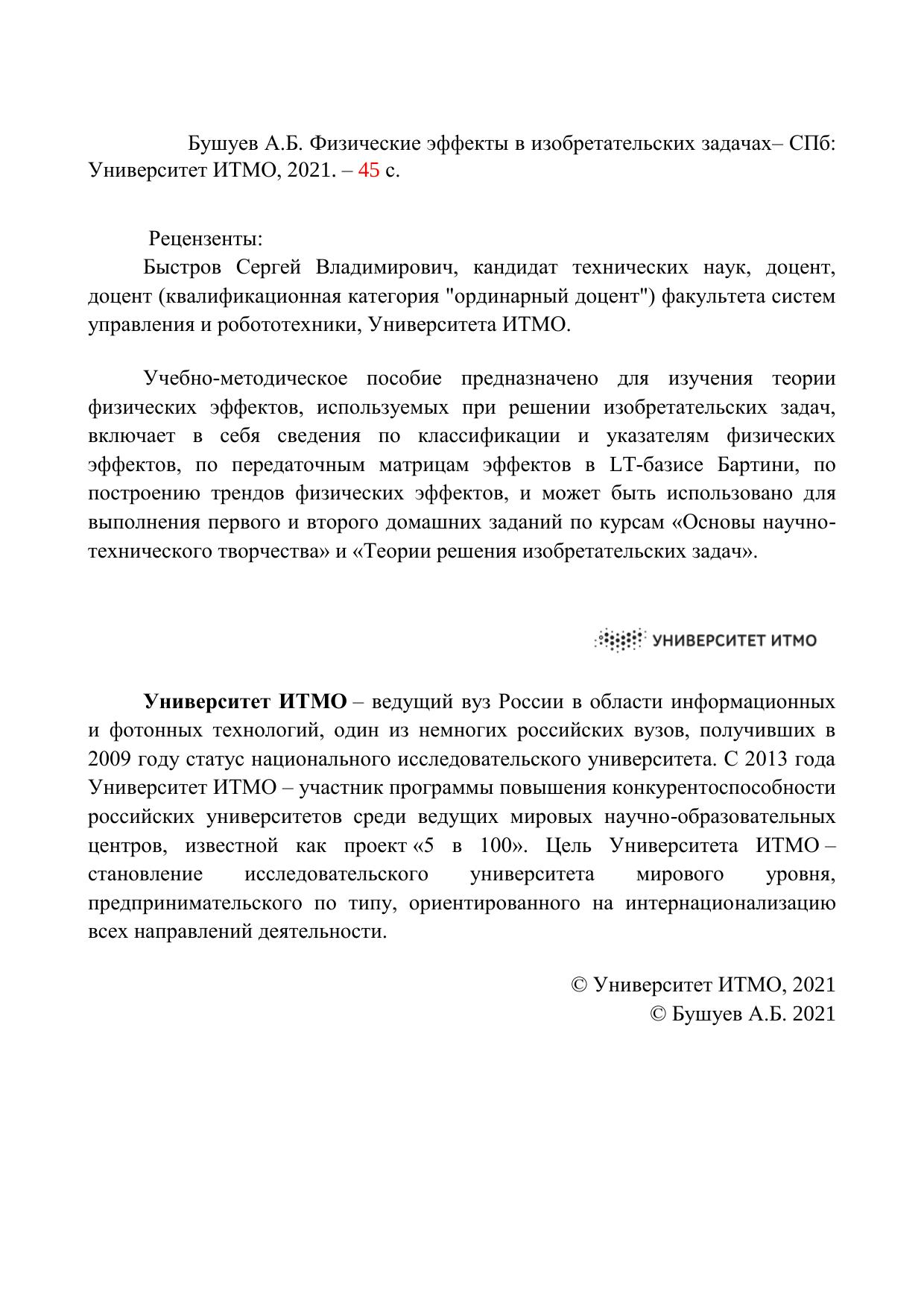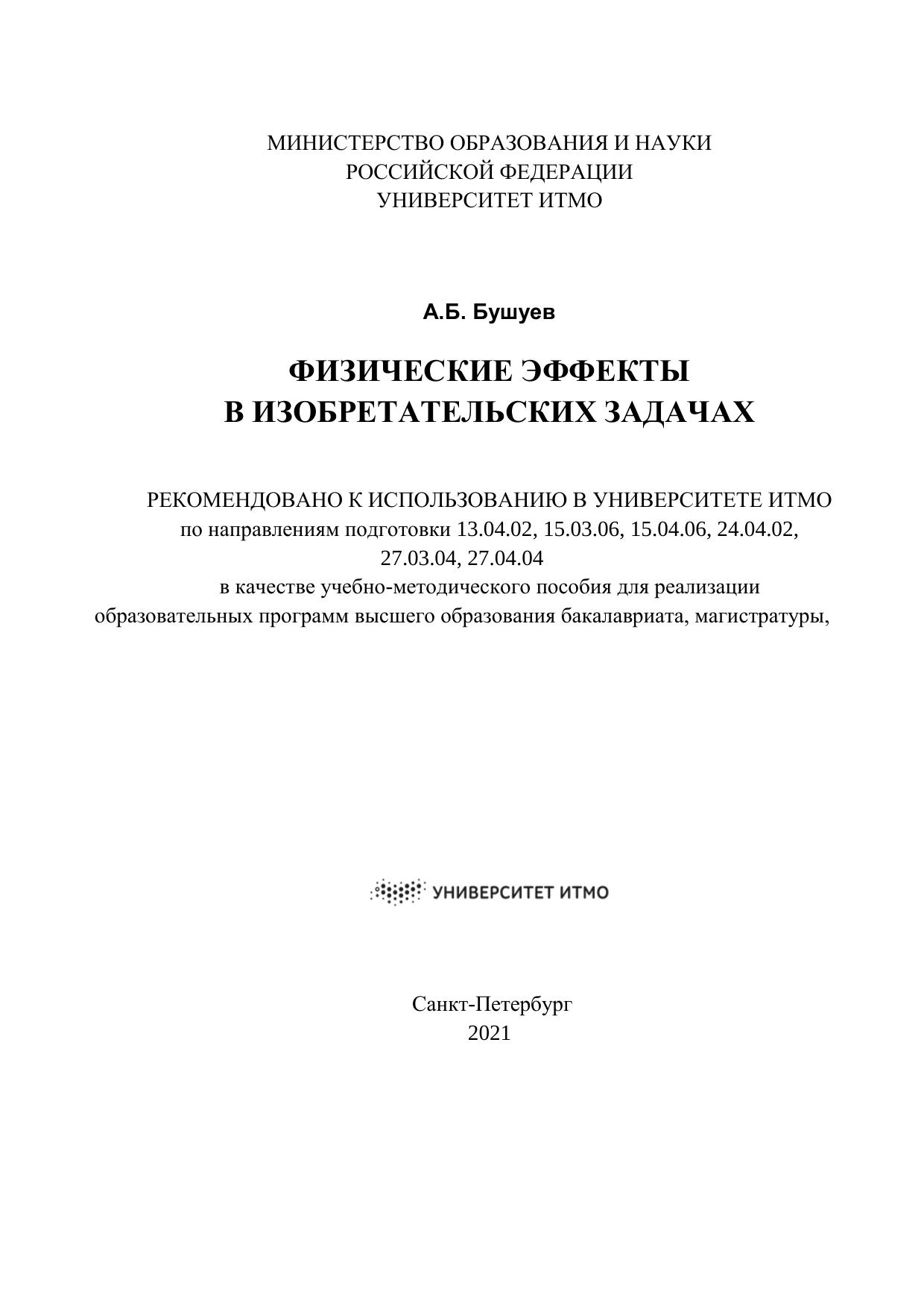 Учебно-методическое пособие предназначено для изучения теории физических эффектов, используемых при решении изобретательских задач, включает в себя сведения по классификации и указателям физических эффектов, по передаточным матрицам эффектов в LT-базисе Бартини, по построению трендов физических эффектов, и может быть использовано для выполнения первого и второго домашних заданий по курсам «Основы научно-технического творчества» и «Теории решения изобретательских задач».