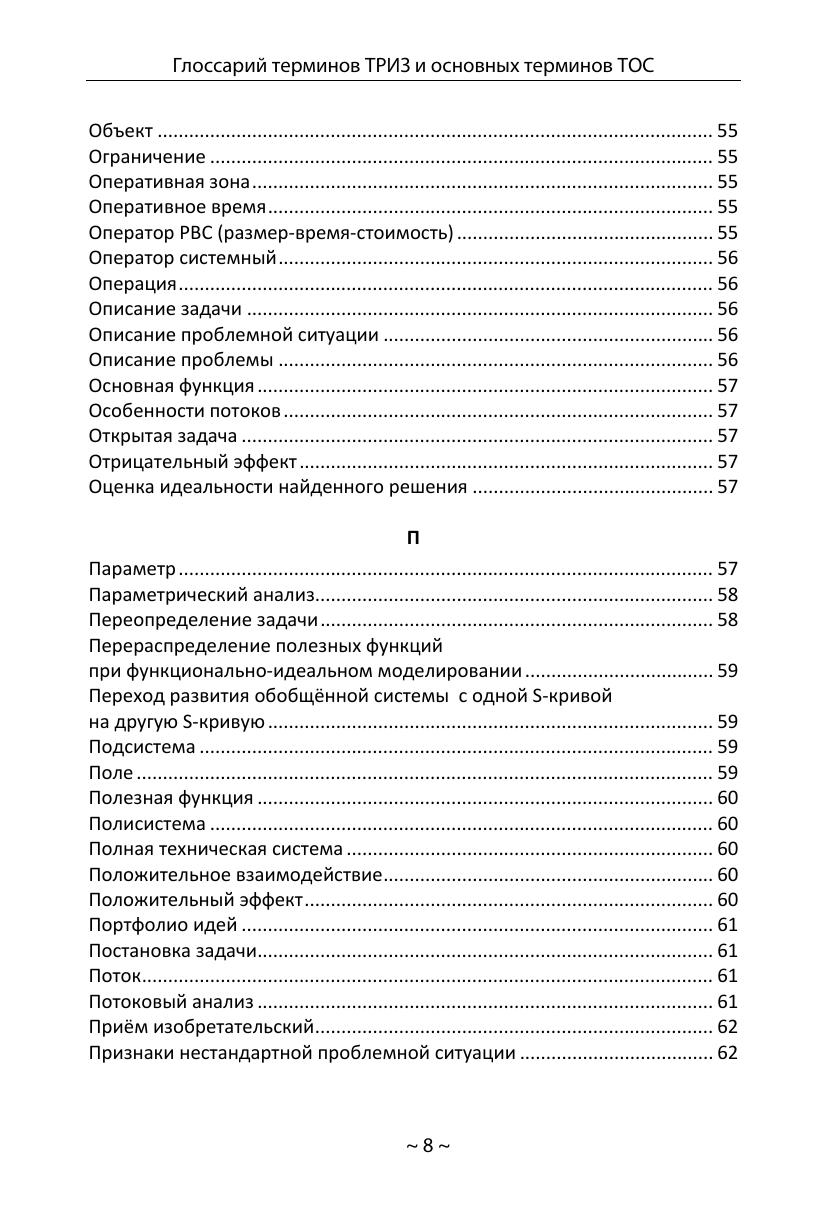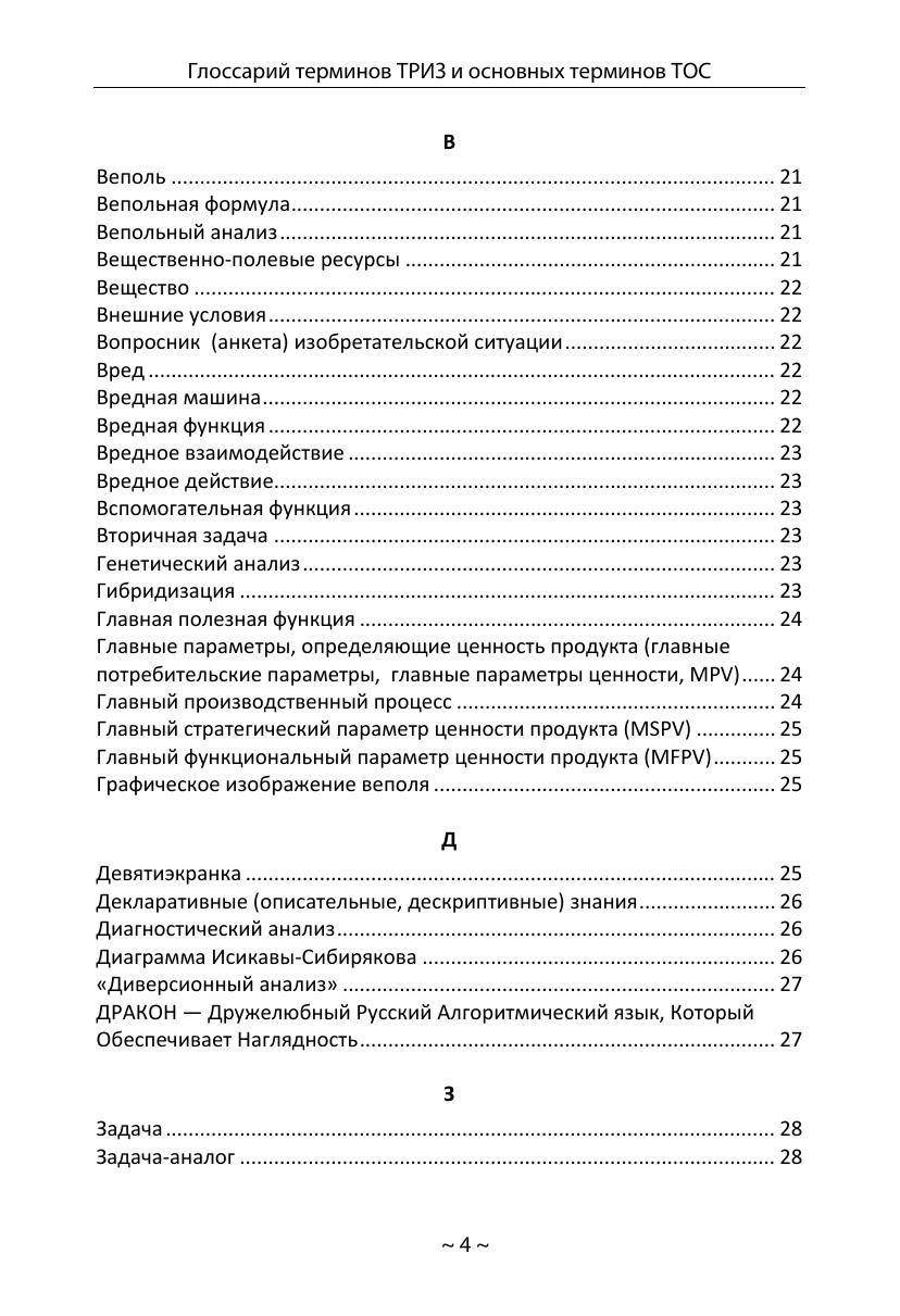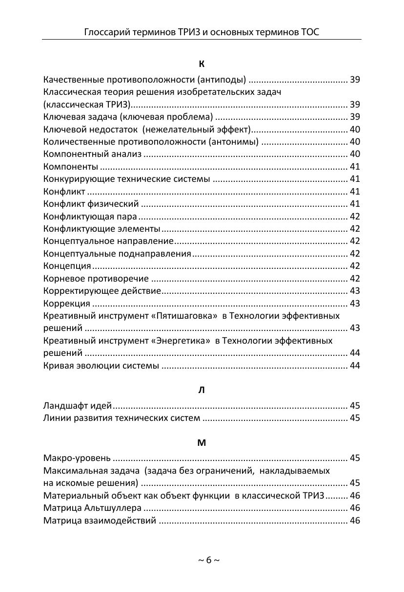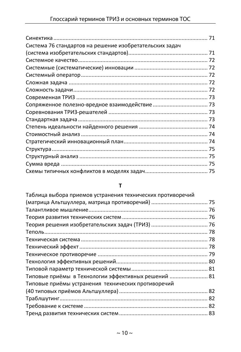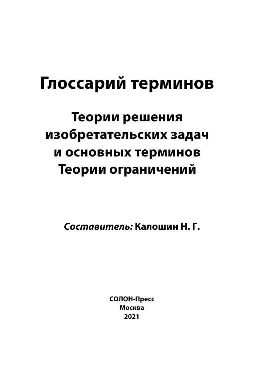 Глоссарий содержит описания 294 терминов Теории решения изобретательских задач (автор ТРИЗ — Г.С. Альтшуллер) и 37 основных терминов Теории ограничений (автор ТОС — Э.М. Голдратт). Глоссарий предназначен для практиков, разработчиков, исследователей, ученых, преподавателей, студентов, связанных с теорией решения изобретательских задач и теорией ограничений. Глоссарий может быть полезен всем тем, кто интересуется современными методологиями решения сложных инженерно-технических, организационно-управленческих и бизнес-задач.