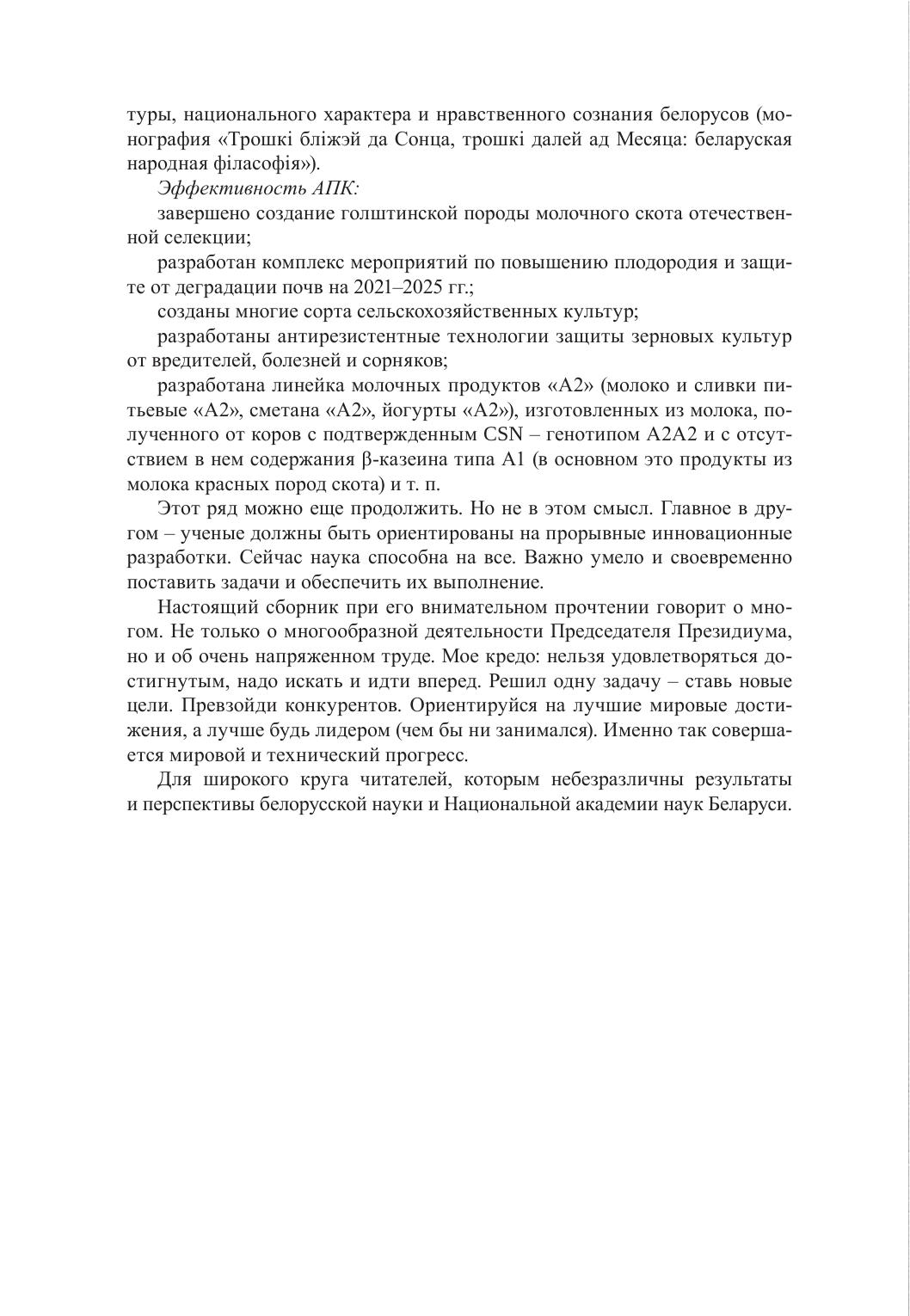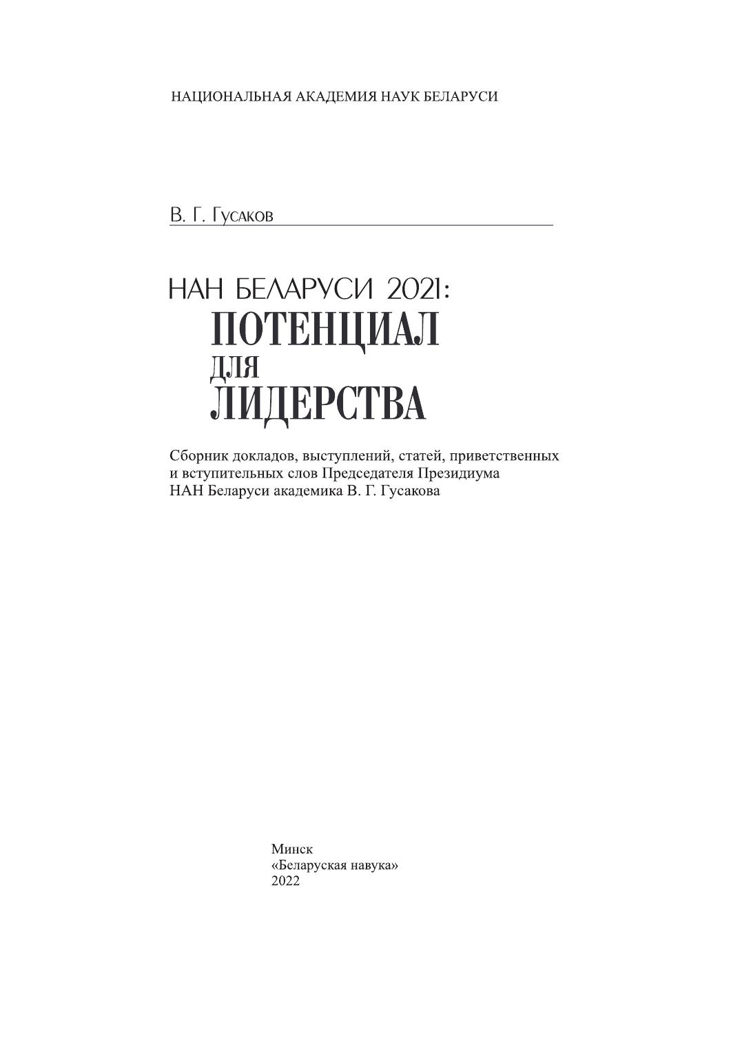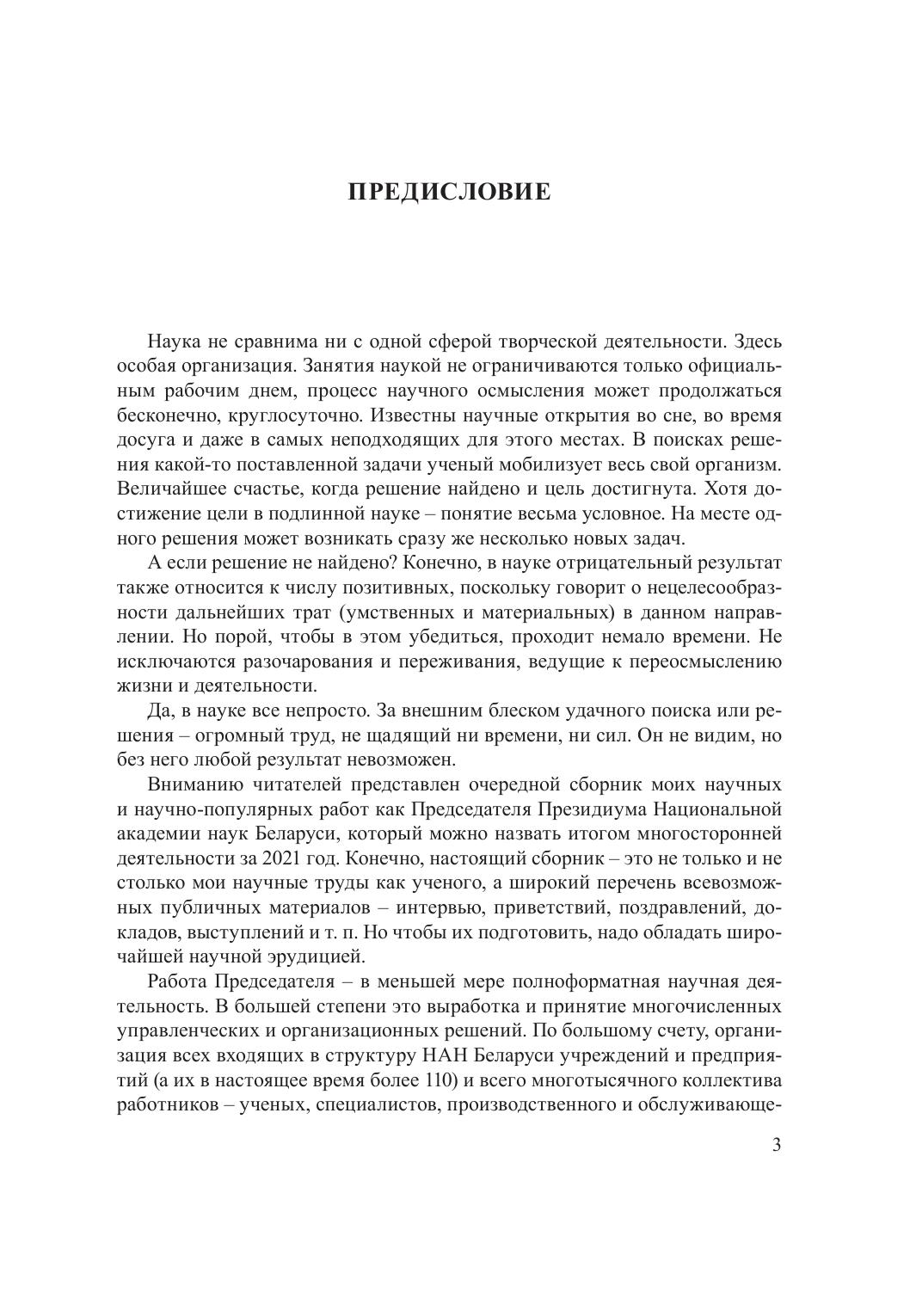 В сборник вошли доклады, научные статьи, ответы на вопросы СМИ, приветственные и вступительные слова участникам научных форумов, конференций, материалы заседаний Председателя Президиума НАН Беларуси В. Г. Гусакова. Материалы представляют собой итог многосторонней деятельности Академии наук за 2021 год, результаты которой во многом связаны с управленческими и организационными решениями, принимаемыми Председателем Президиума.