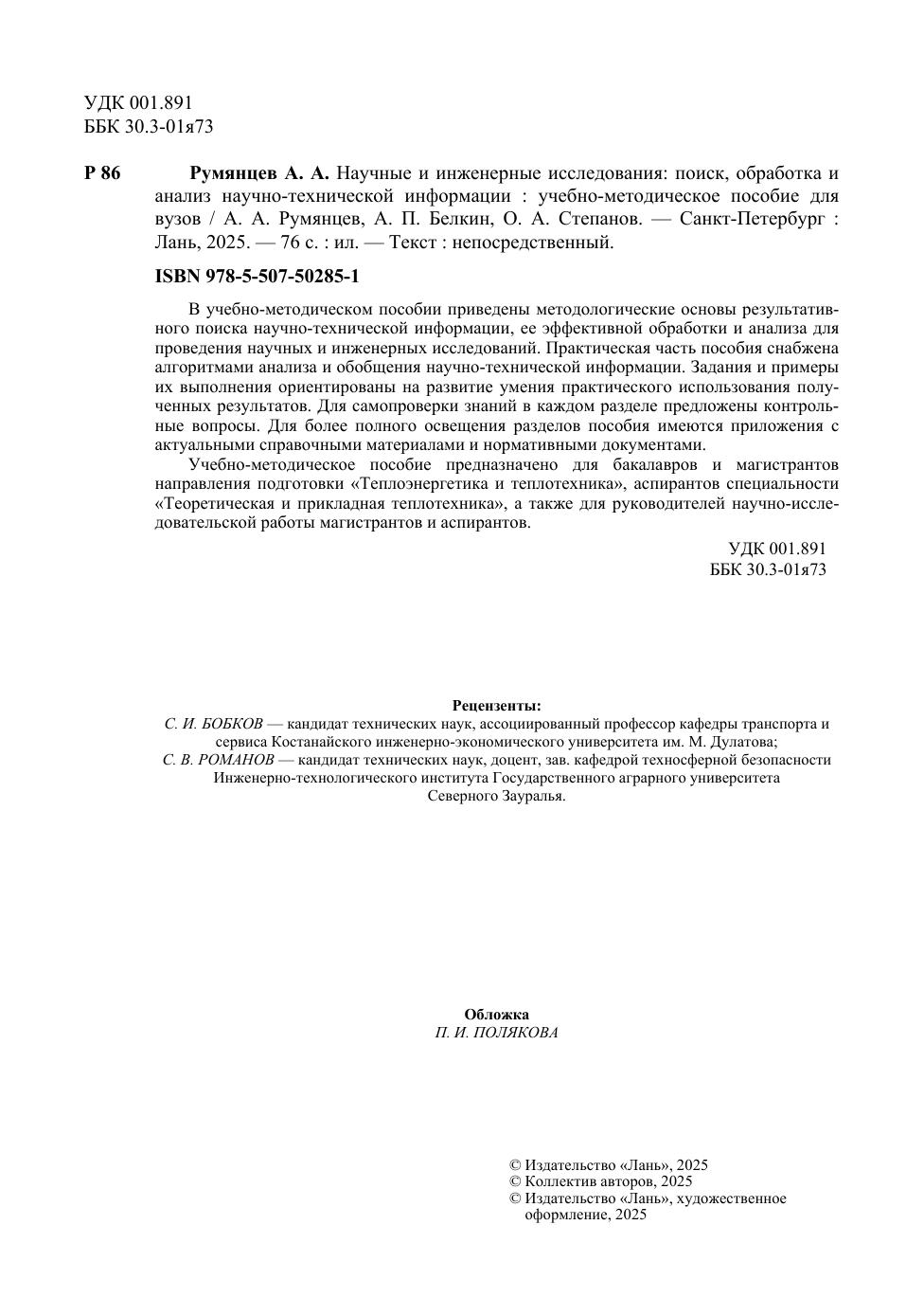 В учебно-методическом пособии приведены методологические основы результативного поиска научно-технической информации, ее эффективной обработки и анализа для проведения научных и инженерных исследований. Практическая часть пособия снабжена алгоритмами анализа и обобщения научно-технической информации. Задания и примеры их выполнения ориентированы на развитие умения практического использования полученных результатов. Для самопроверки знаний в каждом разделе предложены контрольные вопросы. Для более полного освещения разделов пособия имеются приложения с актуальными справочными материалами и нормативными документами. Учебно-методическое пособие предназначено для бакалавров и магистрантов направления подготовки «Теплоэнергетика и теплотехника», аспирантов специальности «Теоретическая и прикладная теплотехника», а также для руководителей научно-исследовательской работы магистрантов и аспирантов.
