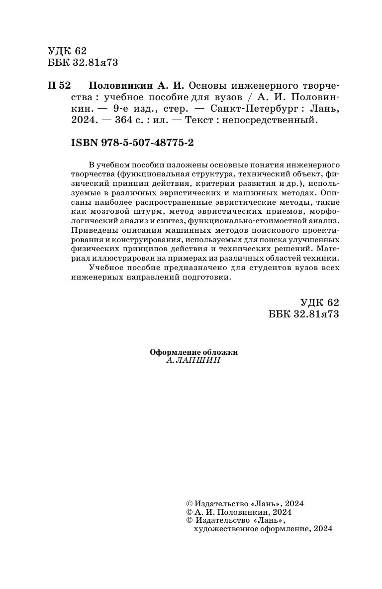 В учебном пособии изложены основные понятия инженерного творчества (функциональная структура, технический объект, физический принцип действия, критерии развития и др.), используемые в различных эвристических и машинных методах. Описаны наиболее распространенные эвристические методы, такие как мозговой штурм, метод эвристических приемов, морфологический анализ и синтез, функционально-стоимостной анализ. Приведены описания машинных методов поискового проектирования и конструирования, используемых для поиска улучшенных физических принципов действия и технических решений. Материал иллюстрирован на примерах из различных областей техники. Учебное пособие предназначено для всех инженерных направлений подготовки.