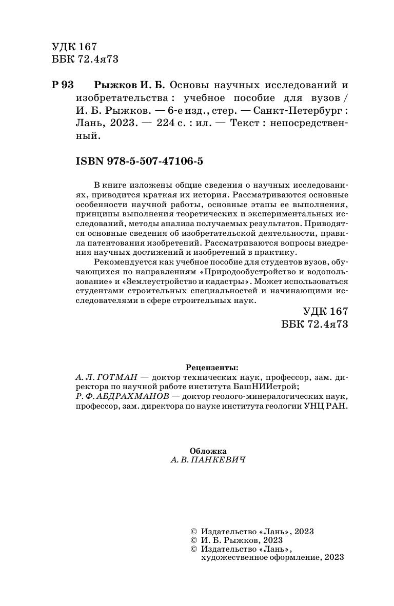 В книге изложены общие сведения о научных исследованиях, приводится краткая их история. Рассматриваются основные особенности научной работы, основные этапы ее выполнения, принципы выполнения теоретических и экспериментальных исследований, методы анализа получаемых результатов. Приводятся основные сведения об изобретательской деятельности, правила патентования изобретений. Рассматриваются вопросы внедрения научных достижений и изобретений в практику. Рекомендуется как учебное пособие для студентов вузов, обучающихся по направлениям «Природообустройство и водопользование» и «Землеустройство и кадастры». Может использоваться студентами строительных специальностей и начинающими исследователями в сфере строительных наук.