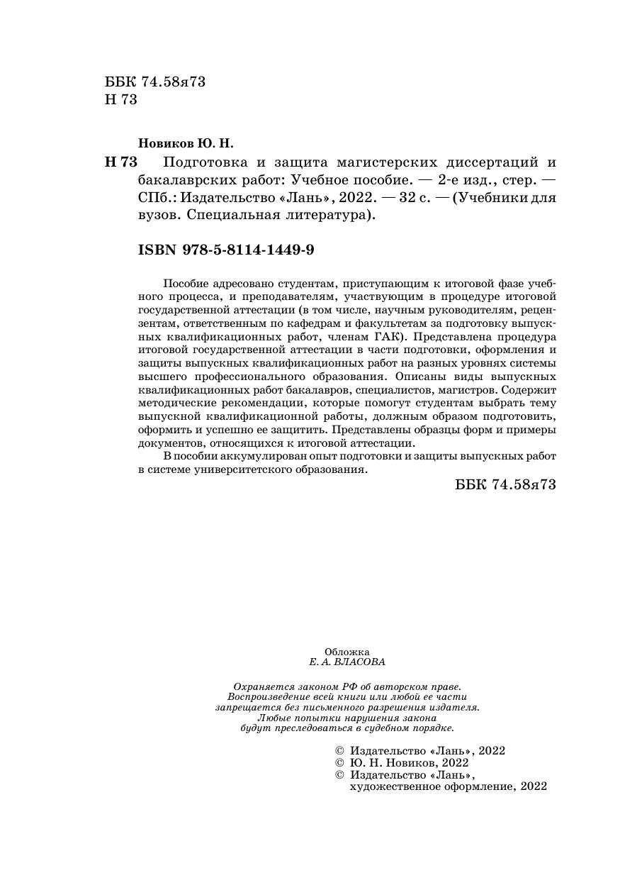 Пособие адресовано студентам, приступающим к итоговой фазе учебного процесса, и преподавателям, участвующим в процедуре итоговой государственной аттестации (в том числе, научным руководителям, рецензентам, ответственным по кафедрам и факультетам за подготовку выпускных квалификационных работ, членам ГАК). Представлена процедура итоговой государственной аттестации в части подготовки, оформления и защиты выпускных квалификационных работ на разных уровнях системы высшего профессионального образования. Описаны виды выпускных квалификационных работ бакалавров, специалистов, магистров. Содержит методические рекомендации, которые помогут студентам выбрать тему выпускной квалификационной работы, должным образом подготовить, оформить и успешно ее защитить. Представлены образцы форм и примеры документов, относящихся к итоговой аттестации. В пособии аккумулирован опыт подготовки и защиты выпускных работ в системе университетского образования.