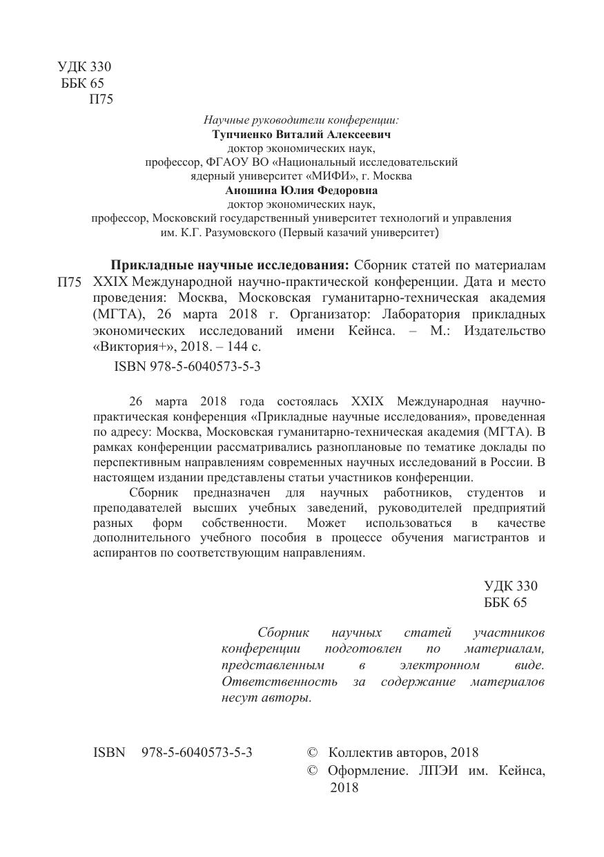 26 марта 2018 года состоялась ХХIХ Международная научно-практическая конференция "Прикладные научные исследования", проведенная по адресу: Москва, Московская гуманитарно-техническая академия (МГТА). В рамках конференции рассматривались разноплановые по тематике доклады по перспективным направлениям современных научных исследований в России. В настоящем издании представлены статьи участников конференции