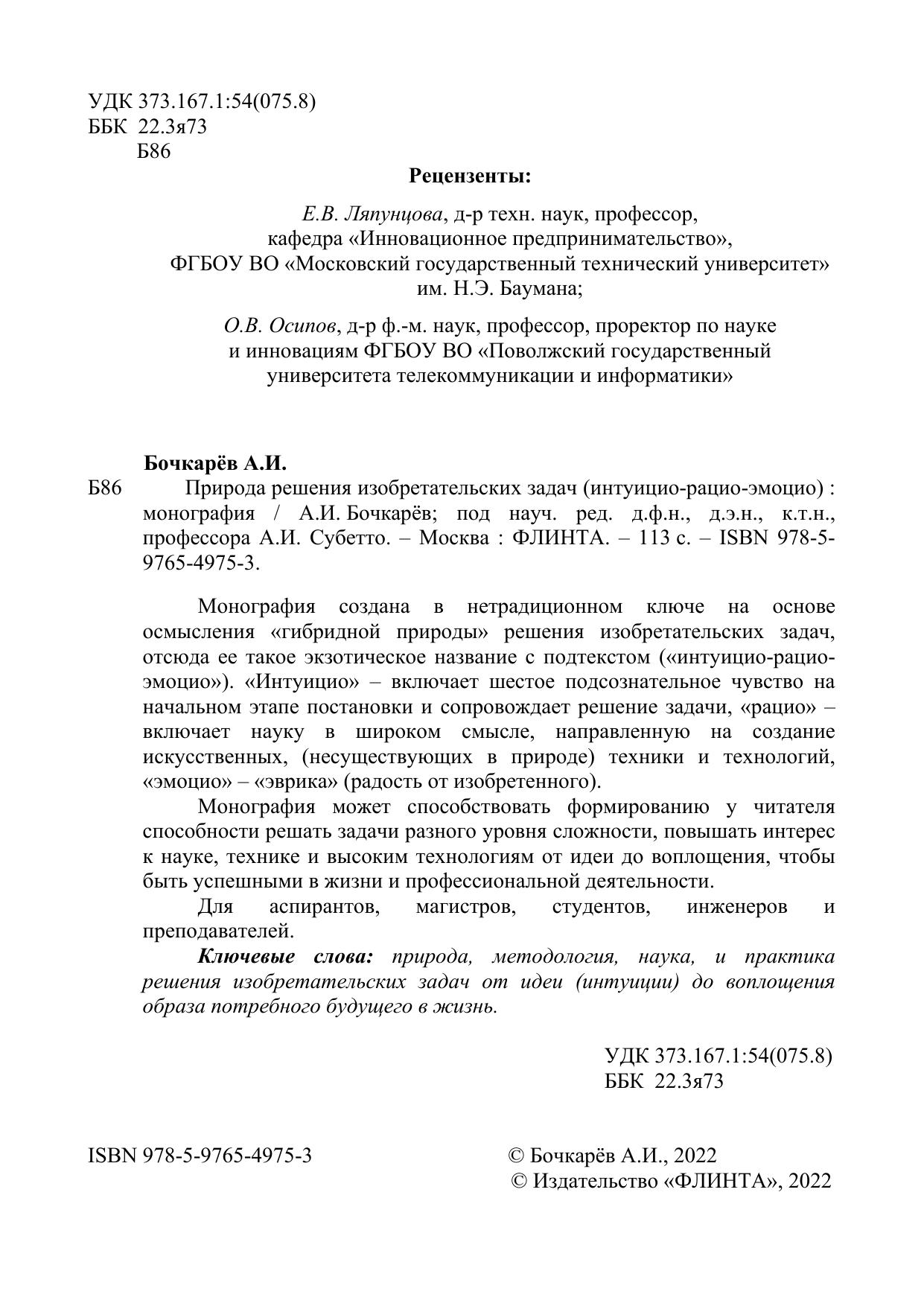 Монография создана в нетрадиционном ключе на основе осмысления «гибридной природы» решения изобретательских задач, отсюда ее такое экзотическое название с подтекстом («интуицио-рацио-эмоцио»). «Интуицио» – включает шестое подсознательное чувство на начальном этапе постановки и сопровождает решение задачи, «рацио» – включает науку в широком смысле, направленную на создание искусственных, (несуществующих в природе) техники и технологий, «эмоцио» – «эврика» (радость от изобретенного).