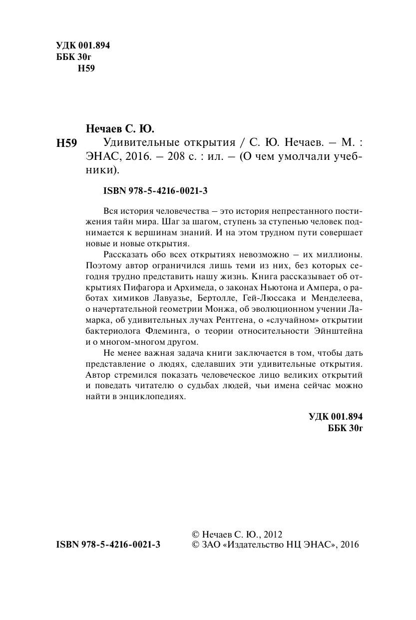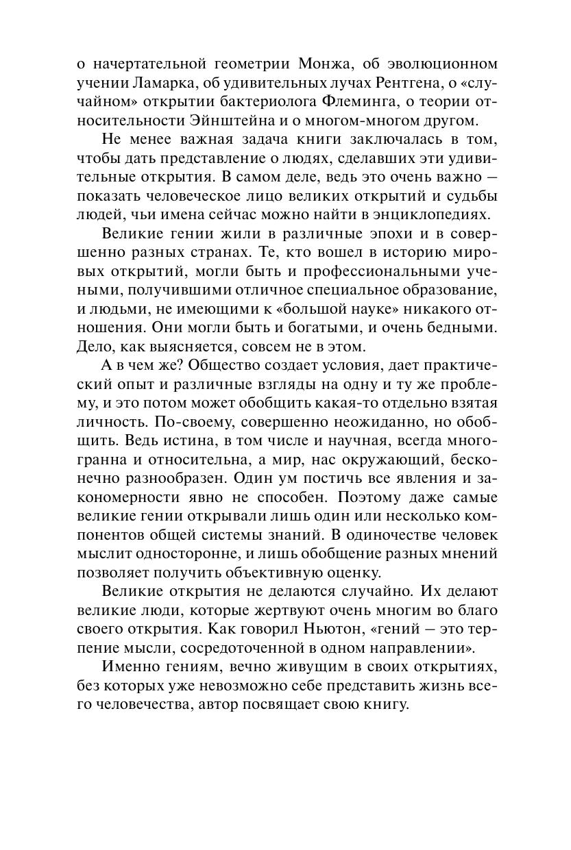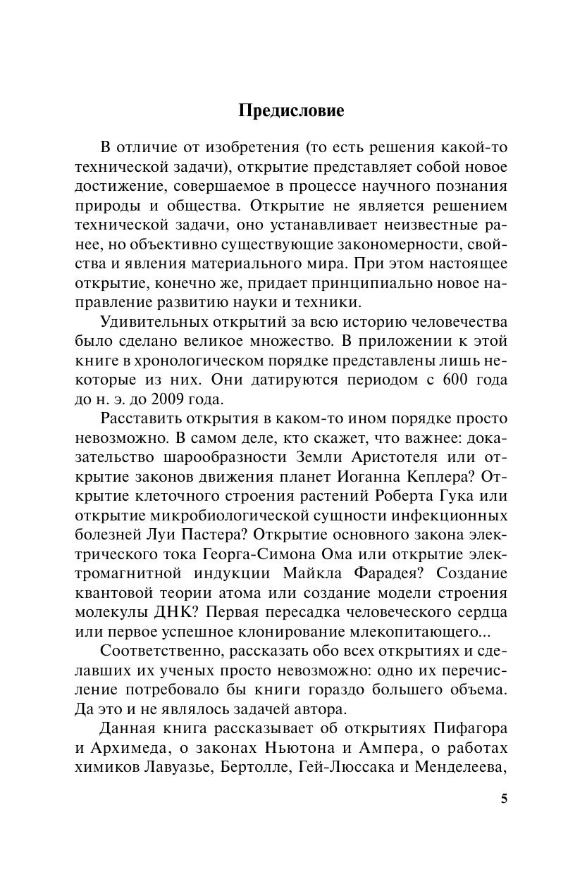 Вся история человечества – это история непрестанного постижения тайн мира. Шаг за шагом, ступень за ступенью человек поднимается к вершинам знаний. И на этом трудном пути совершает новые и новые открытия. Рассказать обо всех открытиях невозможно – их миллионы. Поэтому автор ограничился лишь теми из них, без которых сегодня трудно представить нашу жизнь. Книга рассказывает об открытиях Пифагора и Архимеда, о законах Ньютона и Ампера, о работах химиков Лавуазье, Бертолле, Гей-Люссака и Менделеева, о начертательной геометрии Монжа, об эволюционном учении Ламарка, об удивительных лучах Рентгена, о «случайном» открытии бактериолога Флеминга, о теории относительности Эйнштейна и о многом-многом другом. Не менее важная задача книги заключается в том, чтобы дать представление о людях, сделавших эти удивительные открытия. Автор стремился показать человеческое лицо великих открытий и поведать читателю о судьбах людей, чьи имена сейчас можно найти в энциклопедиях.