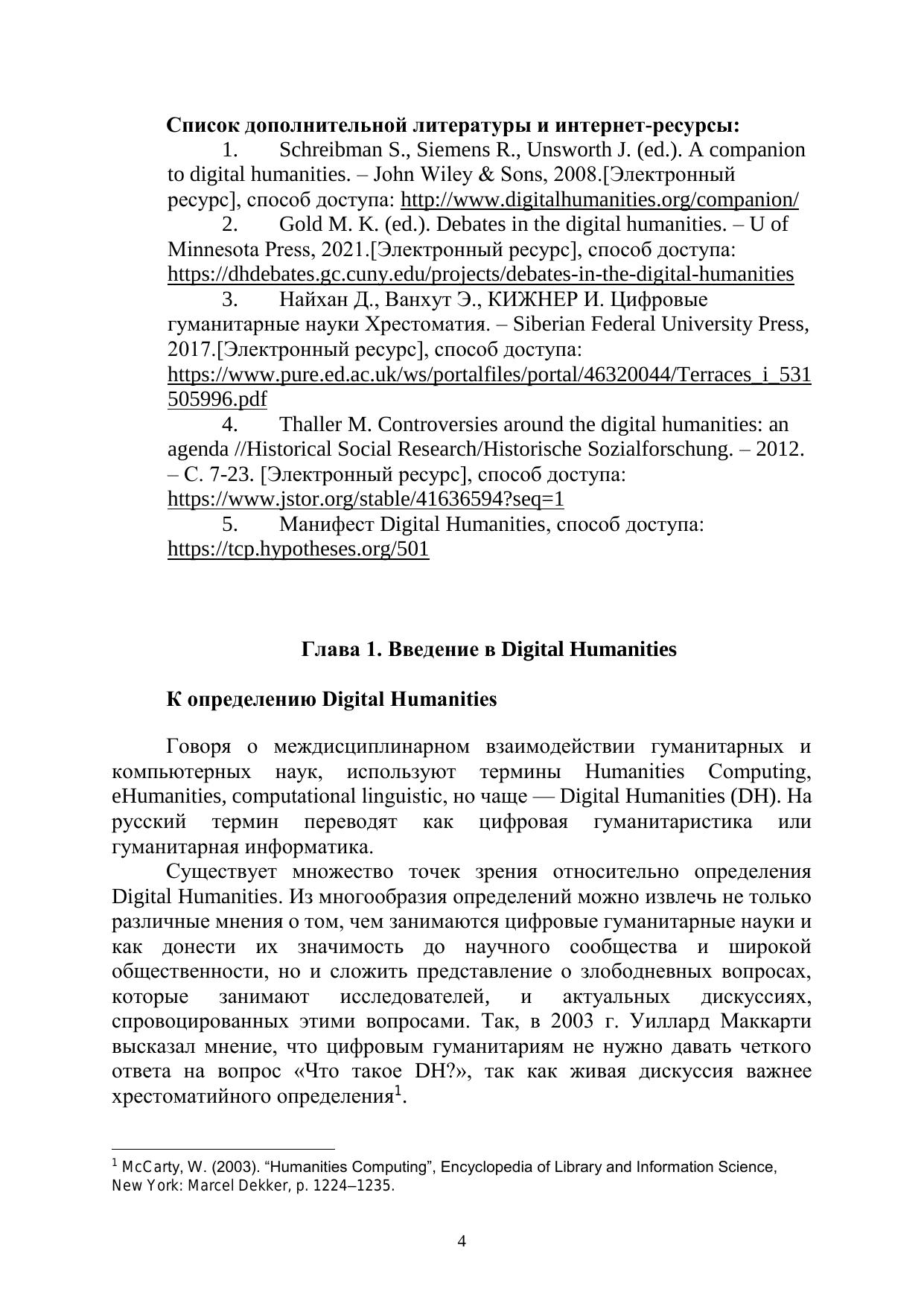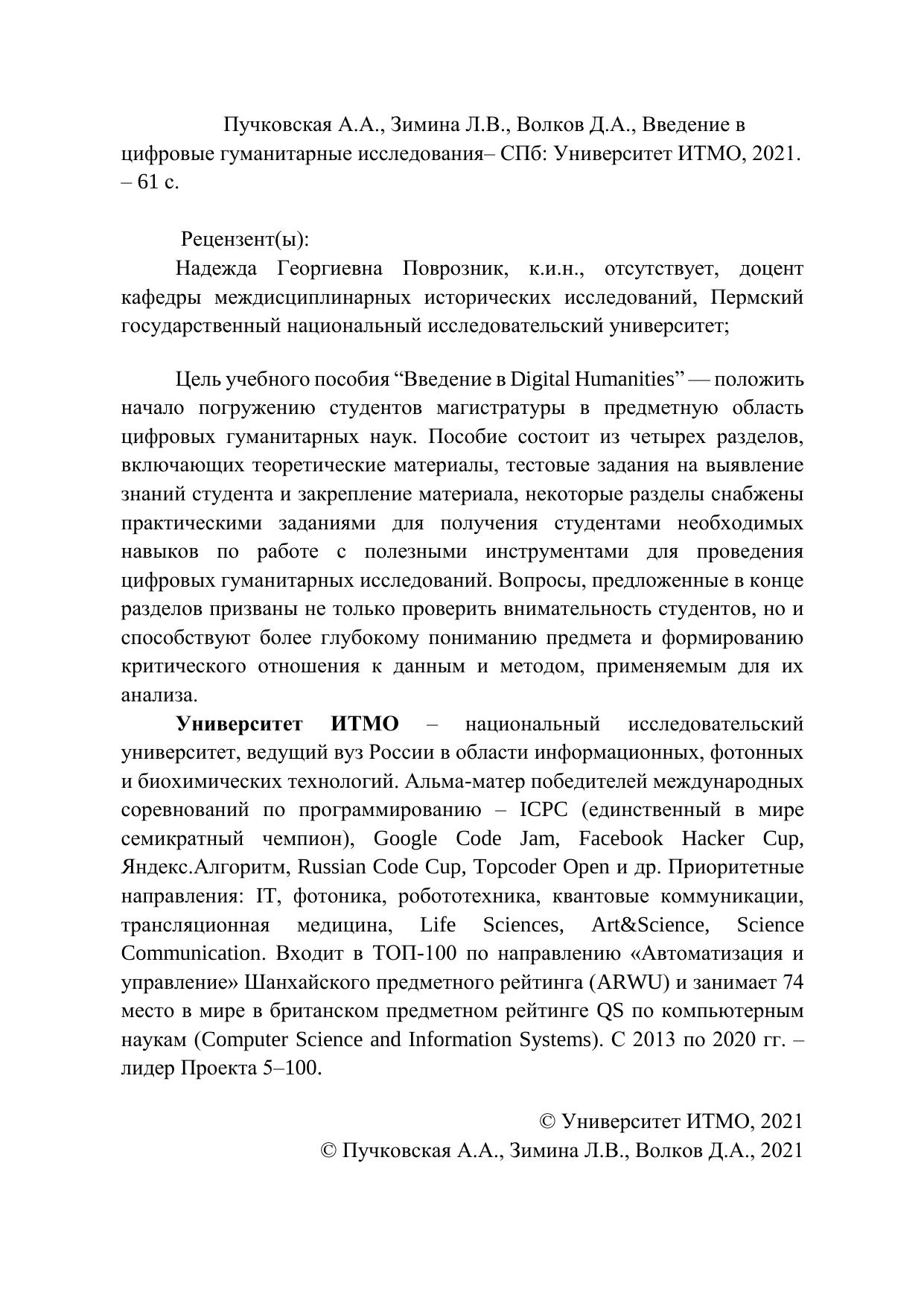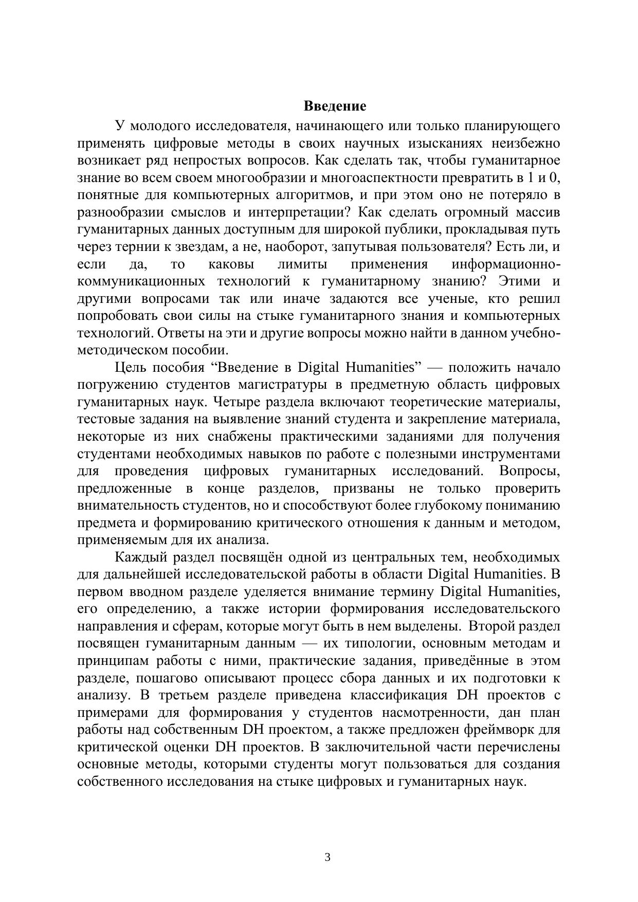 Цель учебного пособия “Введение в Digital Humanities” — положить начало погружению студентов магистратуры в предметную область цифровых гуманитарных наук. Пособие состоит из четырех разделов, включающих теоретические материалы, тестовые задания на выявление знаний студента и закрепление материала, некоторые разделы снабжены практическими заданиями для получения студентами необходимых навыков по работе с полезными инструментами для проведения цифровых гуманитарных исследований. Вопросы, предложенные в конце разделов призваны не только проверить внимательность студентов, но и способствуют более глубокому пониманию предмета и формированию критического отношения к данным и методом, применяемым для их анализа.