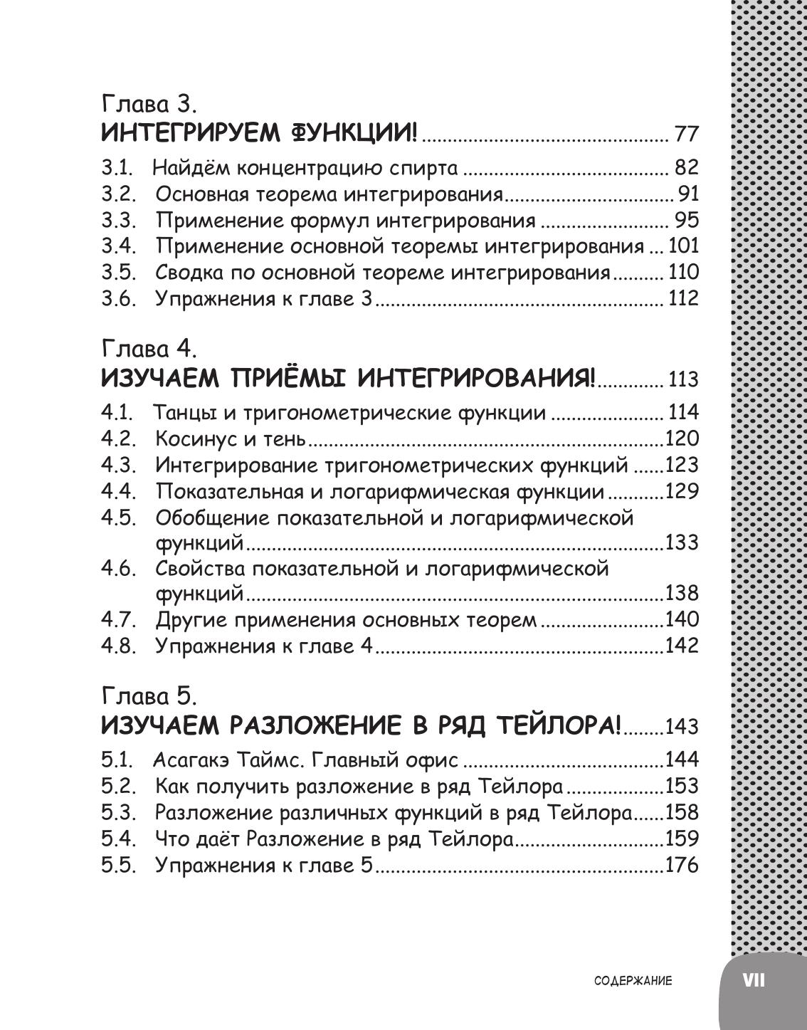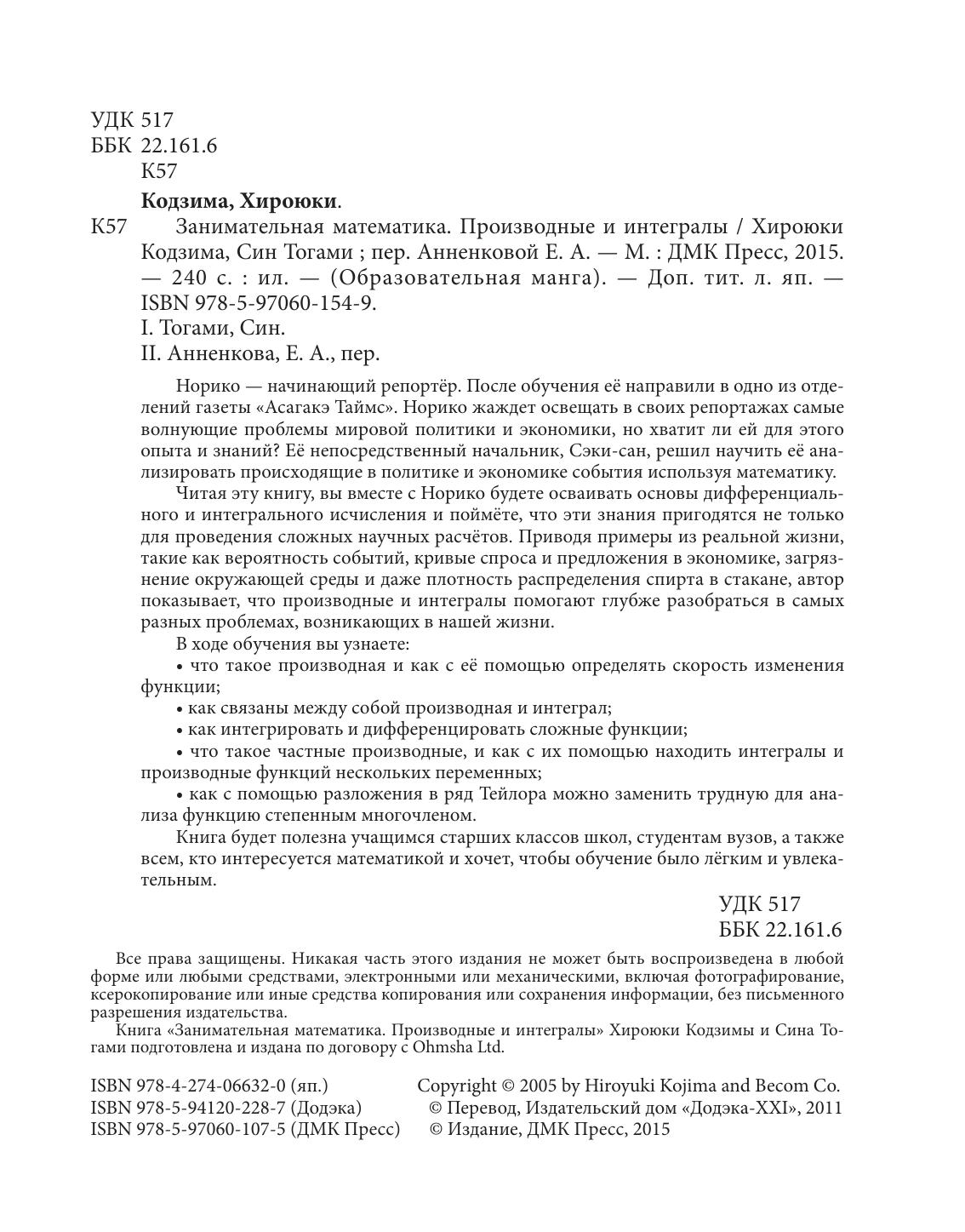 Норико — начинающий репортёр. После обучения её направили в одно из отделений газеты «Асагакэ Таймс». Норико жаждет освещать в своих репортажах самые волнующие проблемы мировой политики и экономики, но хватит ли ей для этого опыта и знаний? Её непосредственный начальник, Сэки-сан, решил научить её анализировать происходящие в политике и экономике события используя математику. Читая эту книгу, вы вместе с Норико будете осваивать основы дифференциального и интегрального исчисления и поймёте, что эти знания пригодятся не только для проведения сложных научных расчётов. Приводя примеры из реальной жизни, такие как вероятность событий, кривые спроса и предложения в экономике, загрязнение окружающей среды и даже плотность распределения спирта в стакане, автор показывает, что производные и интегралы помогают глубже разобраться в самых разных проблемах, возникающих в нашей жизни. В ходе обучения вы узнаете: • что такое производная и как с её помощью определять скорость изменения функции, • как связаны между собой производная и интеграл, • как интегрировать и дифференцировать сложные функции, • что такое частные производные, и как с их помощью находить интегралы и производные функций нескольких переменных, • как с помощью разложения в ряд Тейлора можно заменить трудную для анализа функцию степенным многочленом. Книга будет полезна учащимся старших классов школ, студентам вузов, а также всем, кто интересуется математикой и хочет, чтобы обучение было лёгким и увлекательным.