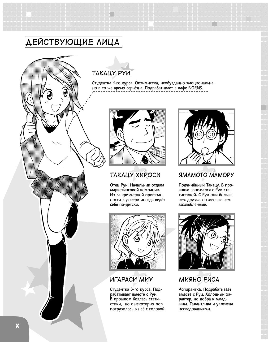 Руи влюблена в Ямамото, работающего в отделе, начальником которого является отец Руи. Но внезапно Ямамото улетает в длительную командировку. Узнав, что его работа в командировке связана с факторным анализом, Руи решает освоить эту науку, чтобы полететь к Ямамото и вместе с ним делать его работу. А помогут ей в этом нелёгком деле её подруги, с которыми она подрабатывает в кафе Norns – аспирантка Риса и студентка Миу. Вмести с ними она узнает, для чего проводят факторный анализ и на конкретном примере освоит методы, применяемые при его проведении. Кроме того она ознакомится с методом главных компонент, который очень похож на факторный анализ, и узнает, в чём его отличие. Если вас интересует, как можно узнать причины (или факторы), побуждающие людей отвечать на вопросы анкет так или иначе, то эта книга для вас.