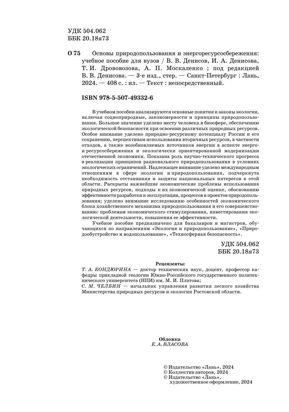 В учебном пособии анализируются основные понятия и законы экологии, включая социоприродные, закономерности и принципы природопользования. Большое значение уделено месту человека в биосфере, обеспечению экологической безопасности при освоении различных природных ресурсов. Особое внимание уделено природно-ресурсному потенциалу России и его сохранению, перспективам использования вторичных ресурсов, в частности отходов, а также возобновляемых источников энергии в аспекте энерго- и ресурсосбережения и экологически ориентированной модернизации отечественной экономики. Показана роль научно-технического прогресса в реализации принципов рационального природопользования в условиях экологических ограничений. Надлежащее внимание уделено международным отношениям в сфере экологии и природопользования, подчеркнута необходимость отстаивания и защиты национальных интересов в этой области. Раскрыты важнейшие экономические проблемы использования природных ресурсов, подходы к их экономической оценке, обоснованию эффективности разработки и эксплуатации, процессов и проектов природопользования, уделено внимание исследованию особенностей экономического блока хозяйственного механизма природопользования и его совершенствованию: проблемам экономического стимулирования, инвестирования экологической деятельности, повышения ее эффективности. Учебное пособие предназначено для бакалавров и магистров, обучающихся по направлениям «Экология и природопользование», «Природообустройство и водопользование», «Техносферная безопасность».