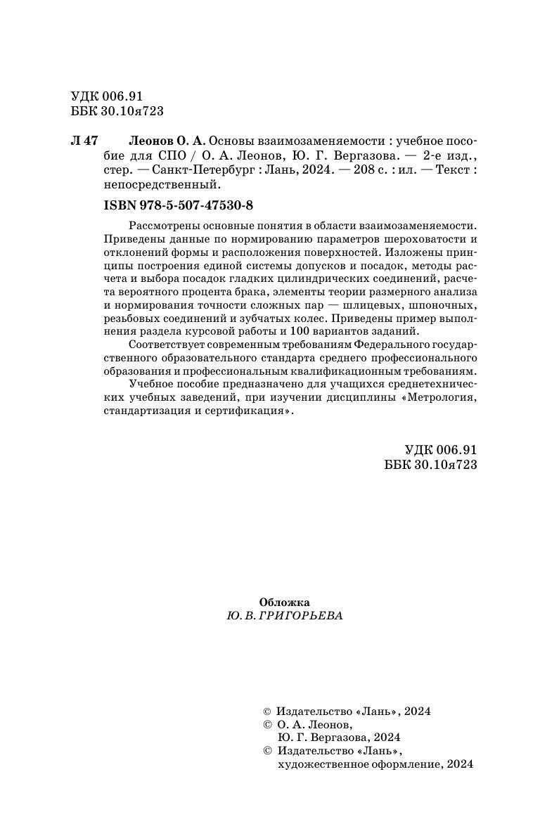Рассмотрены основные понятия в области взаимозаменяемости. Приведены данные по нормированию параметров шероховатости и отклонений формы и расположения поверхностей. Изложены принципы построения единой системы допусков и посадок, методы расчета и выбора посадок гладких цилиндрических соединений, расчета вероятного процента брака, элементы теории размерного анализа и нормирования точности сложных пар — шлицевых, шпоночных, резьбовых соединений и зубчатых колес. Приведены пример выполнения раздела курсовой работы и 100 вариантов заданий Соответствует современным требованиям Федерального государственного образовательного стандарта среднего профессионального образования и профессиональным квалификационным требованиям.. Учебное пособие предназначено для учащихся среднетехнических учебных заведений, при изучении дисциплины «Метрология, стандартизация и сертификация».