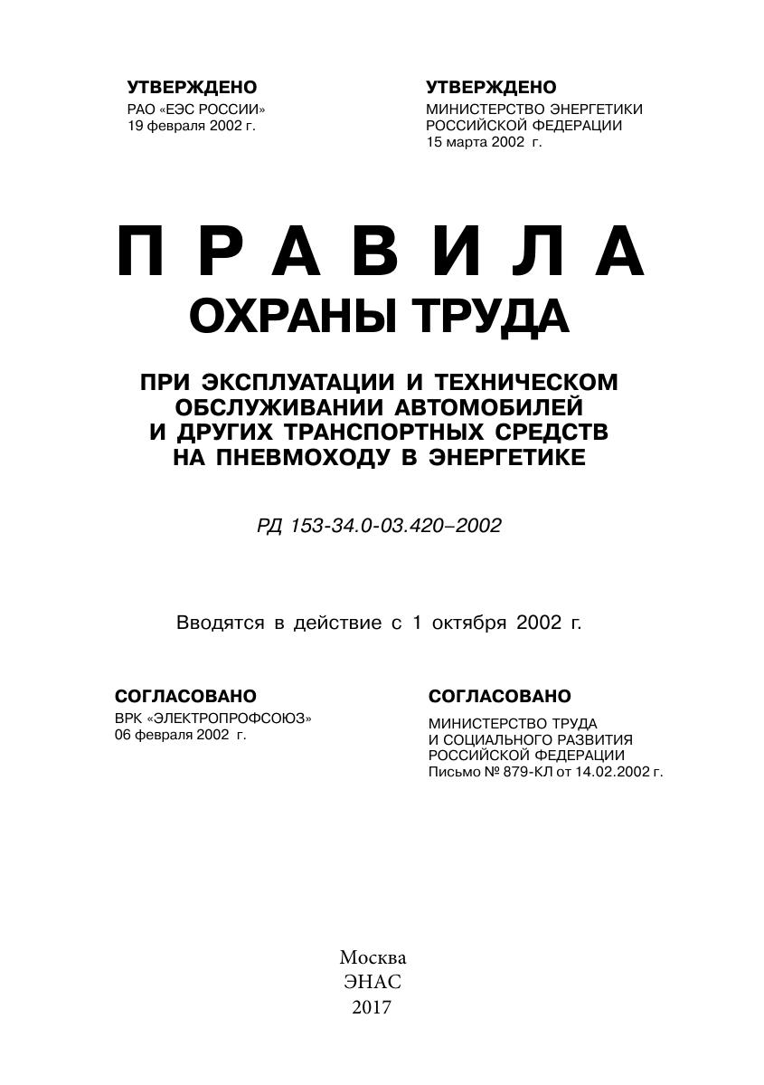 Правила охраны труда при эксплуатации и техническом обслуживании автомобилей и других транспортных средств на пневмоходу в энергетике. РД 153-34.0-03.420–2002