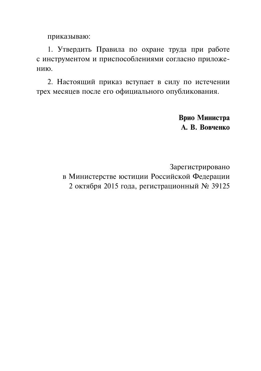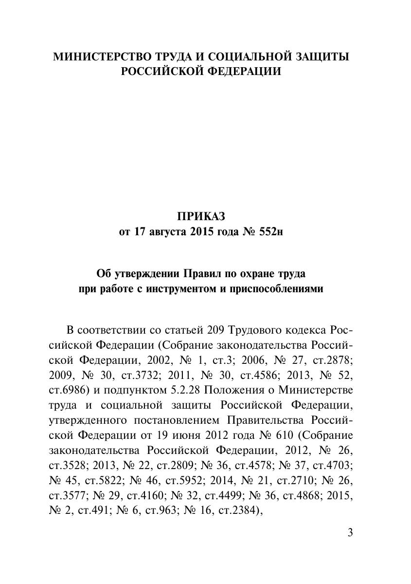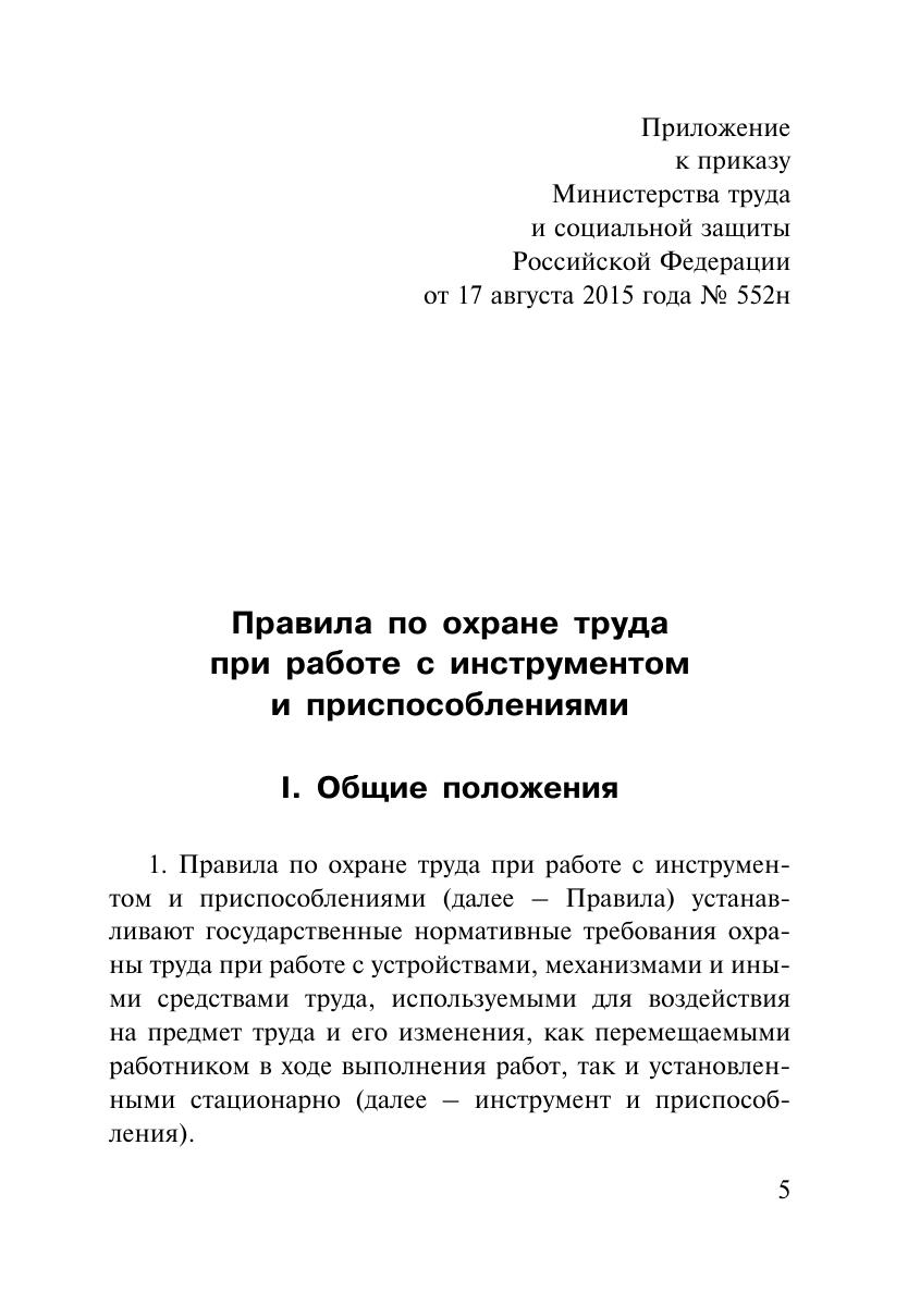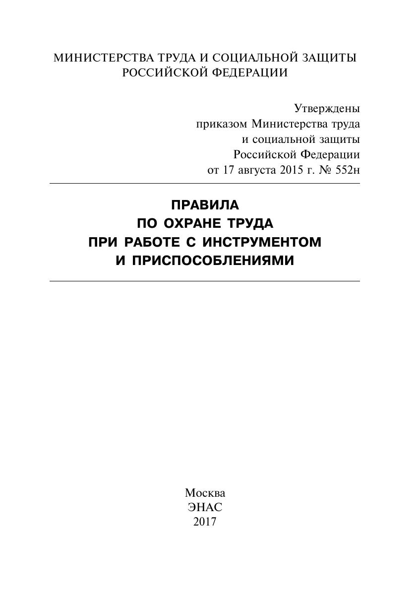 Правила по охране труда при работе с инструментом и приспособлениями утверждены приказом Министерства труда и социальной защиты Российской Федерации от 17 августа 2015 года № 552н и зарегистрированы в Министерстве юстиции Российской Федерации 2 октября 2015 года, регистрационный № 39125. Правила устанавливают государственные нормативные требования охраны труда при работе с устройствами, механизмами и иными средствами труда, используемыми для воздействия на предмет труда и его изменения, как перемещаемыми работником в ходе выполнения работ, так и установленными стационарно. Требования Правил обязательны для исполнения работодателями, являющимися индивидуальными предпринимателями, а также работодателями – юридическими лицами независимо от их организационно-правовой формы, осуществляющими работы с применением указанных в Правилах видов инструмента и приспособлений.