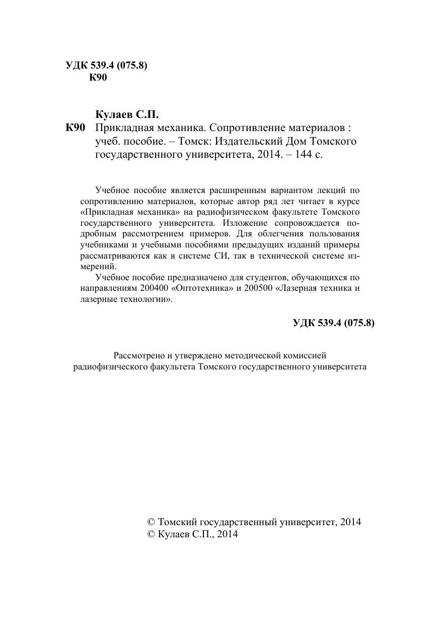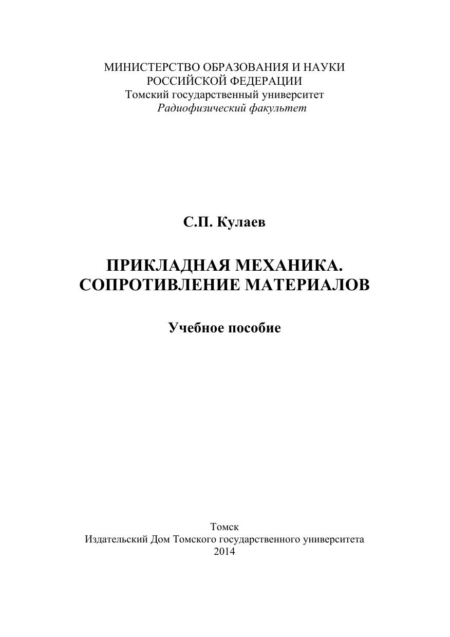 Учебное пособие является расширенным вариантом лекций по сопротивлению материалов, которые автор ряд лет читает в курсе «Прикладная механика» на радиофизическом факультете Томского государственного университета. Изложение сопровождается подробным рассмотрением примеров. Для облегчения пользования учебниками и учебными пособиями предыдущих изданий примеры рассматриваются как в системе СИ, так в технической системе измерений. Учебное пособие предназначено для студентов, обучающихся по направлениям 200400 «Оптотехника» и 200500 «Лазерная техника и лазерные технологии».