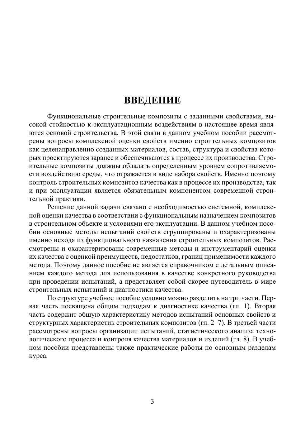 Представлена концепция диагностики качества строительных композитов Охарактеризованы основные методы испытаний свойств строительных композитов с оценкой преимуществ, недостатков, границ применимости. Рассмотрены методы идентификации параметров состава и структуры строительных композитов. Рассмотрены вопросы организации испытаний, статистического анализа параметров технологического процесса и качества продукции как инструмента комплексной оценки качества строительных материалов и изделий. Представлены практические работы по основным разделам курса. Предназначено для бакалавров и магистрантов, обучающихся по направлению «Строительство», аспирантов обучающихся по направлению «Техника и технология строительства».