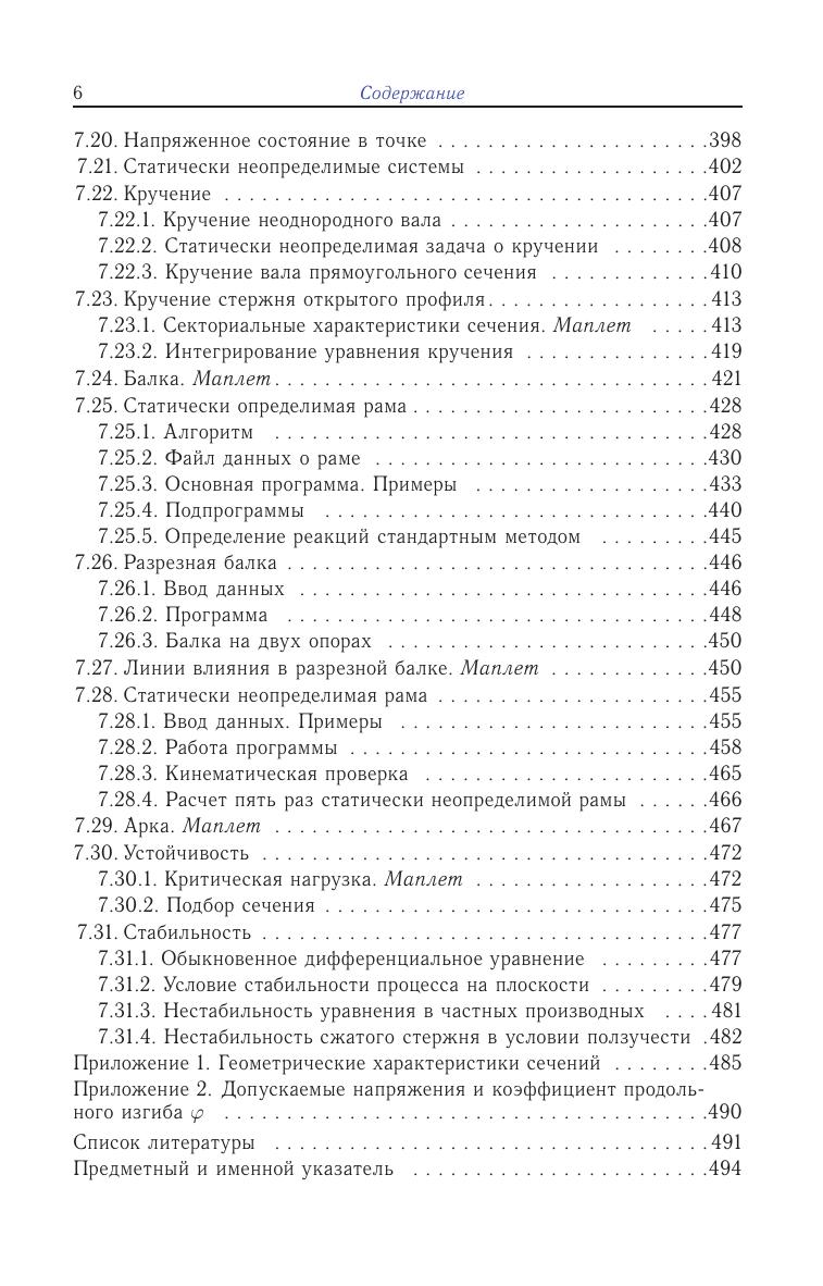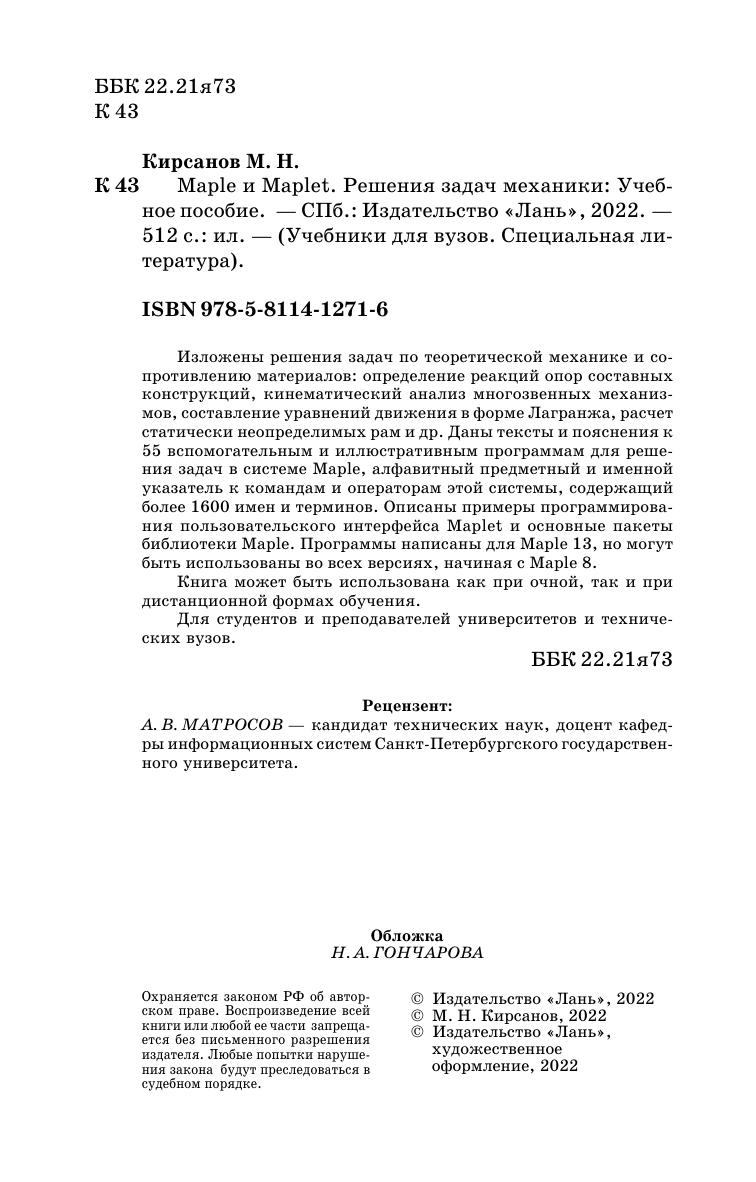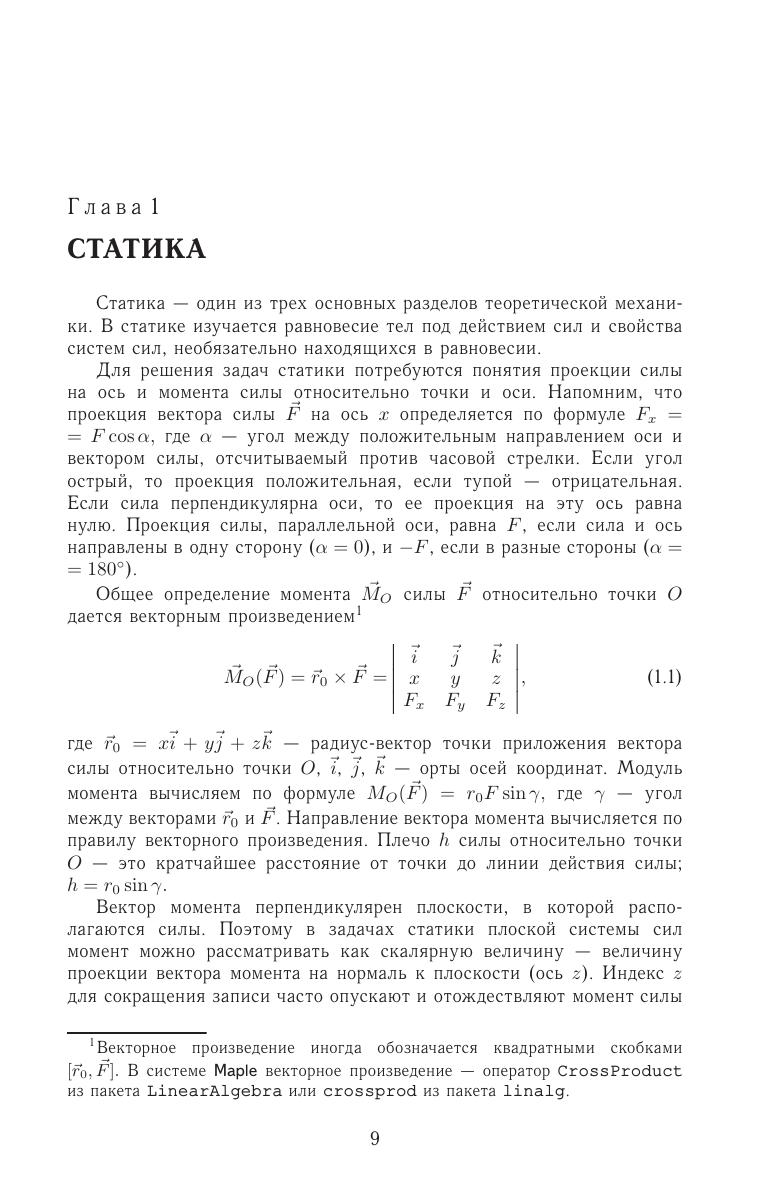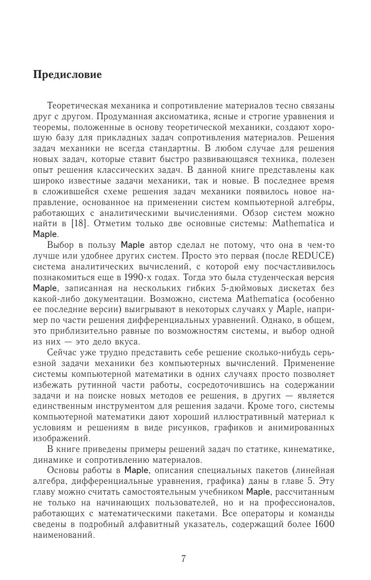 Изложены решения задач по теоретической механике и сопротивлению материалов: определение реакций опор составных конструкций, кинематический анализ многозвенных механизмов, составление уравнений движения в форме Лагранжа, расчет статически неопределимых рам и др. Даны тексты и пояснения к 55 вспомогательным и иллюстративным программам для решения задач в системе Maple, алфавитный предметный и именной указатель к командам и операторам этой системы, содержащий более 1600 имен и терминов. Описаны примеры программирования пользовательского интерфейса Maplet и основные пакеты библиотеки Maple. Программы написаны для Maple 13, но могут быть использованы во всех версиях, начиная с Maple 8. Книга может быть использована как при очной, так и при дистанционной формах обучения. Для студентов и преподавателей университетов и технических вузов.