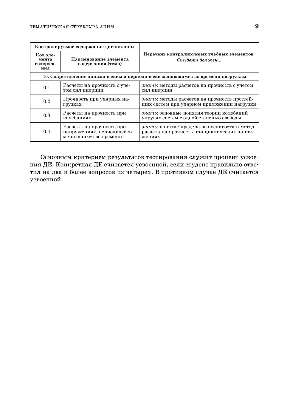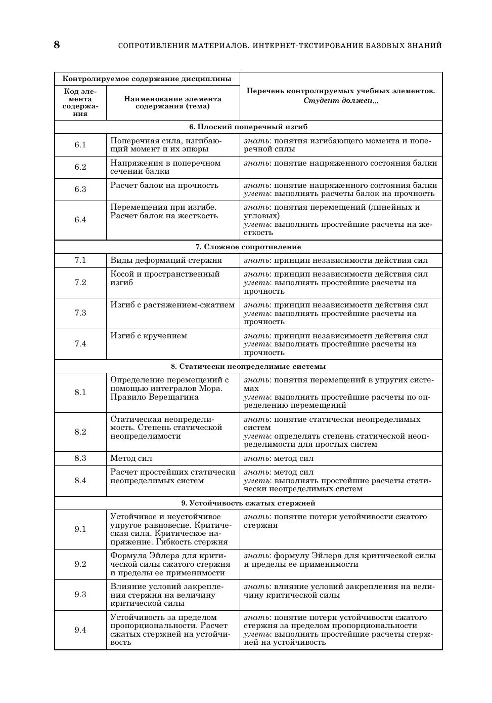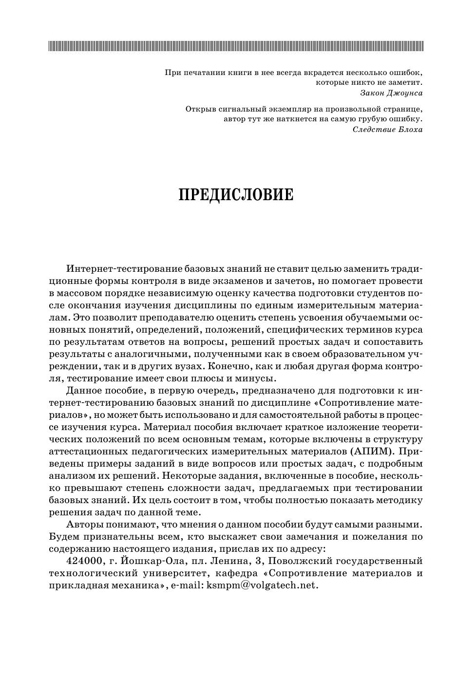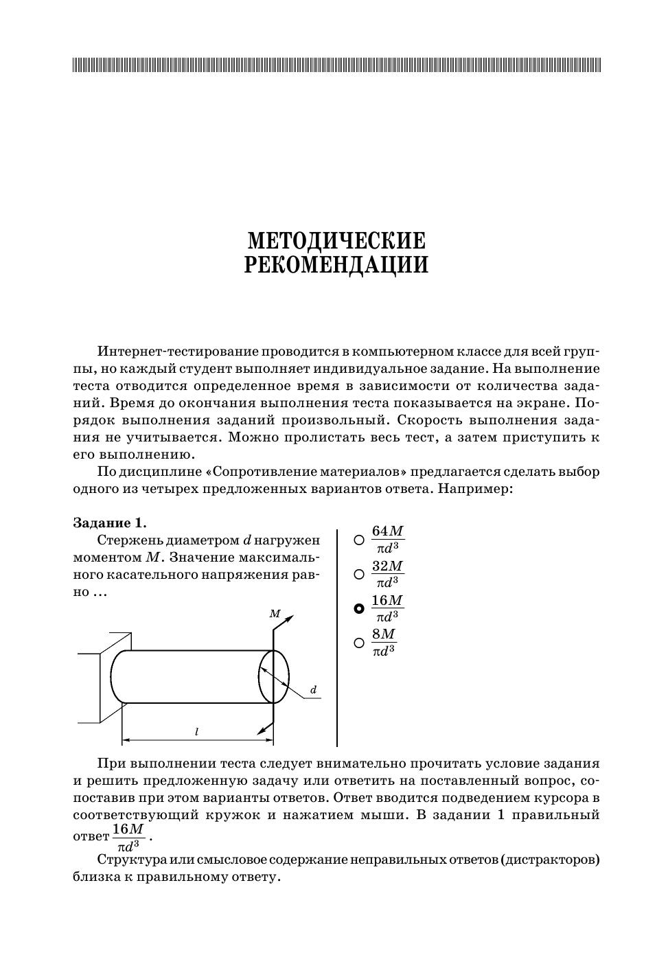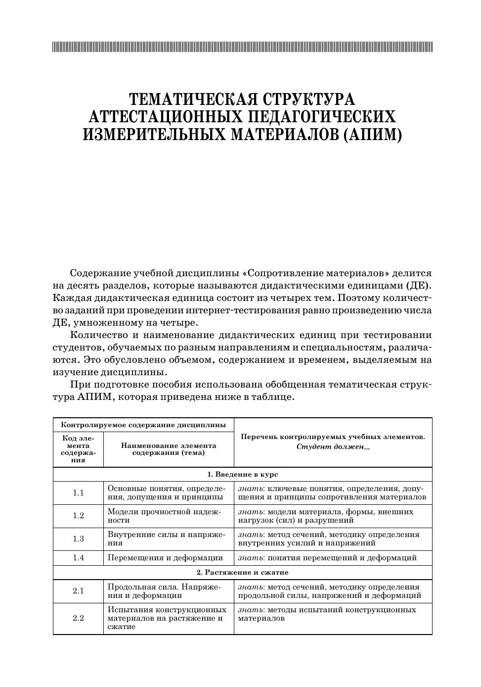 Учебное пособие содержит краткие теоретические сведения по дисциплине «Сопротивление материалов» и примеры тестовых заданий с решениями. Тематическая структура пособия полностью совпадает со структурой аттестационных педагогических измерительных материалов (АПИМ), которая содержит десять разделов (дидактических единиц). Каждый раздел, в свою очередь, состоит из четырех подразделов (тем). Принятая структура определяет специфику проведения и оценки результатов тестирования. Пособие предназначено для подготовки студентов высших учебных заведений к интернет-тестированию по сопротивлению материалов в рамках мониторинга качества учебного процесса учреждений высшего профессионального образования. Материал, изложенный в пособии, может быть использован и для самостоятельной работы при изучении курса сопротивления материалов.