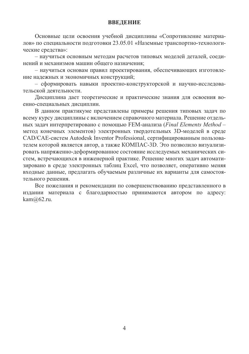 Содержит примеры решения типовых задач по всему курсу дисциплины «Сопротивление материалов». Для улучшения образного восприятия объектов расчетов обучаемыми ряд расчетных схем сопровождаются изображениями 3D-моделей элементов конструкций, разработанных в среде САПР, в том числе и по результатам FEM-анализа их напряженно-деформированного состояния.