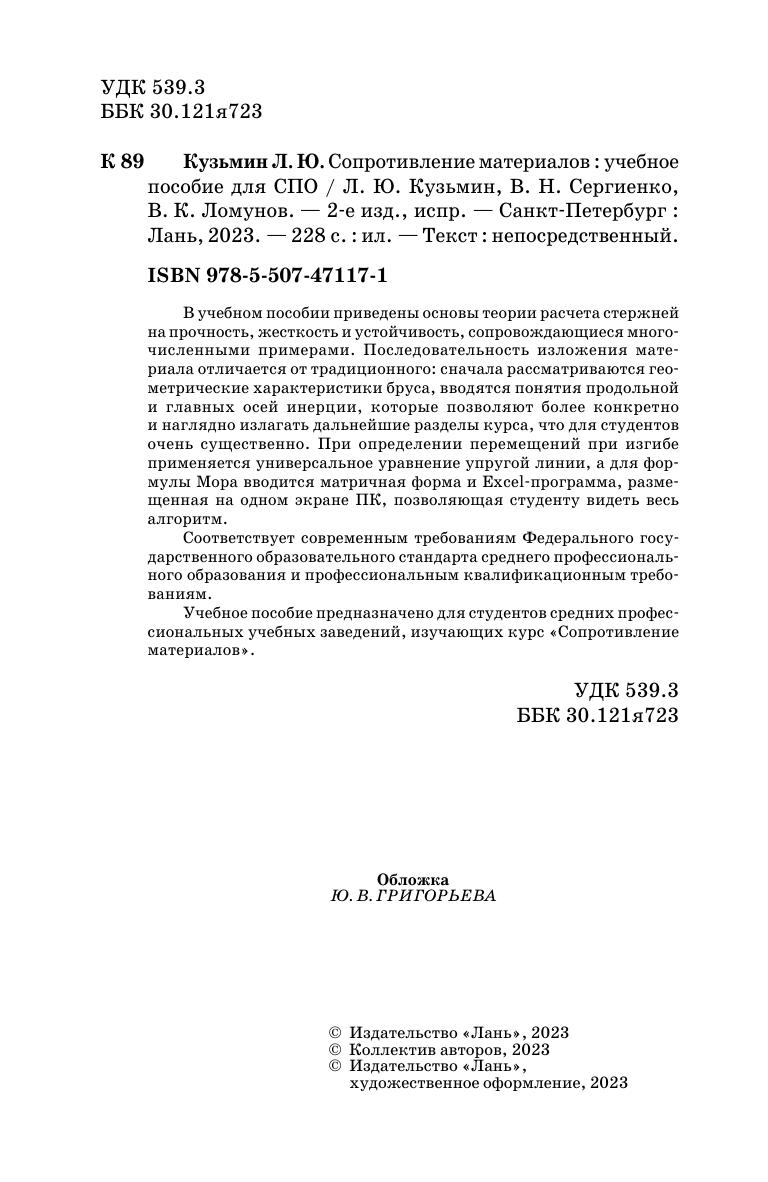 В учебном пособии приведены основы теории расчета стержней на прочность, жесткость и устойчивость, сопровождающиеся многочисленными примерами. Последовательность изложения материала отличается от традиционного: сначала рассматриваются геометрические характеристики бруса, вводятся понятия продольной и главных осей инерции, которые позволяют более конкретно и наглядно излагать дальнейшие разделы курса, что для студентов очень существенно. При определении перемещений при изгибе применяется универсальное уравнение упругой линии, а для формулы Мора вводится матричная форма и Excel-программа, размещенная на одном экране ПК, позволяющая студенту видеть весь алгоритм. Соответствует современным требованиям Федерального государственного образовательного стандарта среднего профессионального образования и профессиональным квалификационным требованиям. Учебное пособие предназначено для студентов средних профессиональных учебных заведений, изучающих курс «Сопротивление материалов».