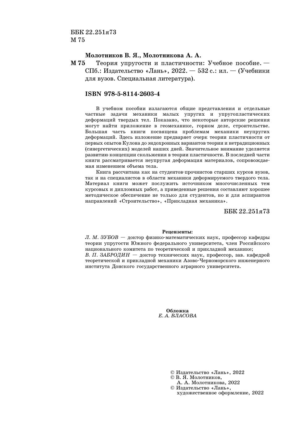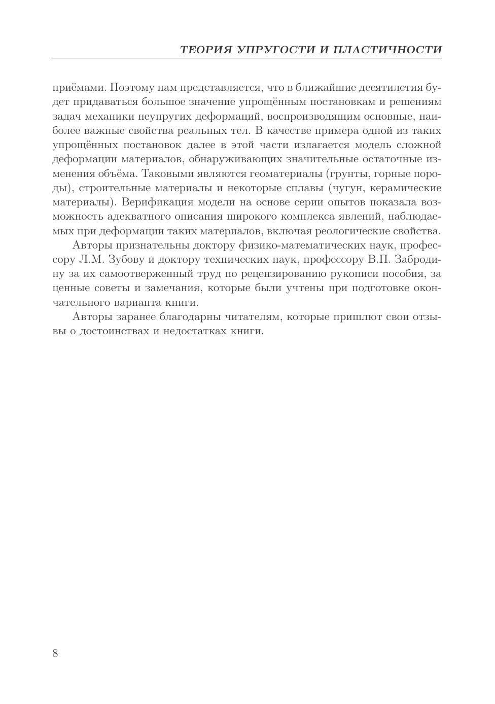 В учебном пособии излагаются общие представления и отдельные частные задачи механики малых упругих и упругопластических деформаций твердых тел. Показано, что некоторые авторские решения могут найти приложение в геомеханике, горном деле, строительстве. Большая часть книги посвящена проблемам механики неупругих деформаций. Здесь изложение предваряет очерк теории пластичности от первых опытов Кулона до эндохронных вариантов теории и нетрадиционных (синергетических) моделей наших дней. Значительное внимание уделяется развитию концепции скольжения в теории пластичности. В последней части книги рассматривается неупругая деформация материалов, сопровождаемая изменением объема тела. Книга рассчитана как на студентов-прочнистов старших курсов вузов, так и на специалистов в области механики деформируемого твердого тела. Материал книги может послужить источником многочисленных тем курсовых и дипломных работ, а приведенные решения составляют хорошее методическое обеспечение не только для студентов, но и для аспирантов направлений «Строительство», «Прикладная механика».