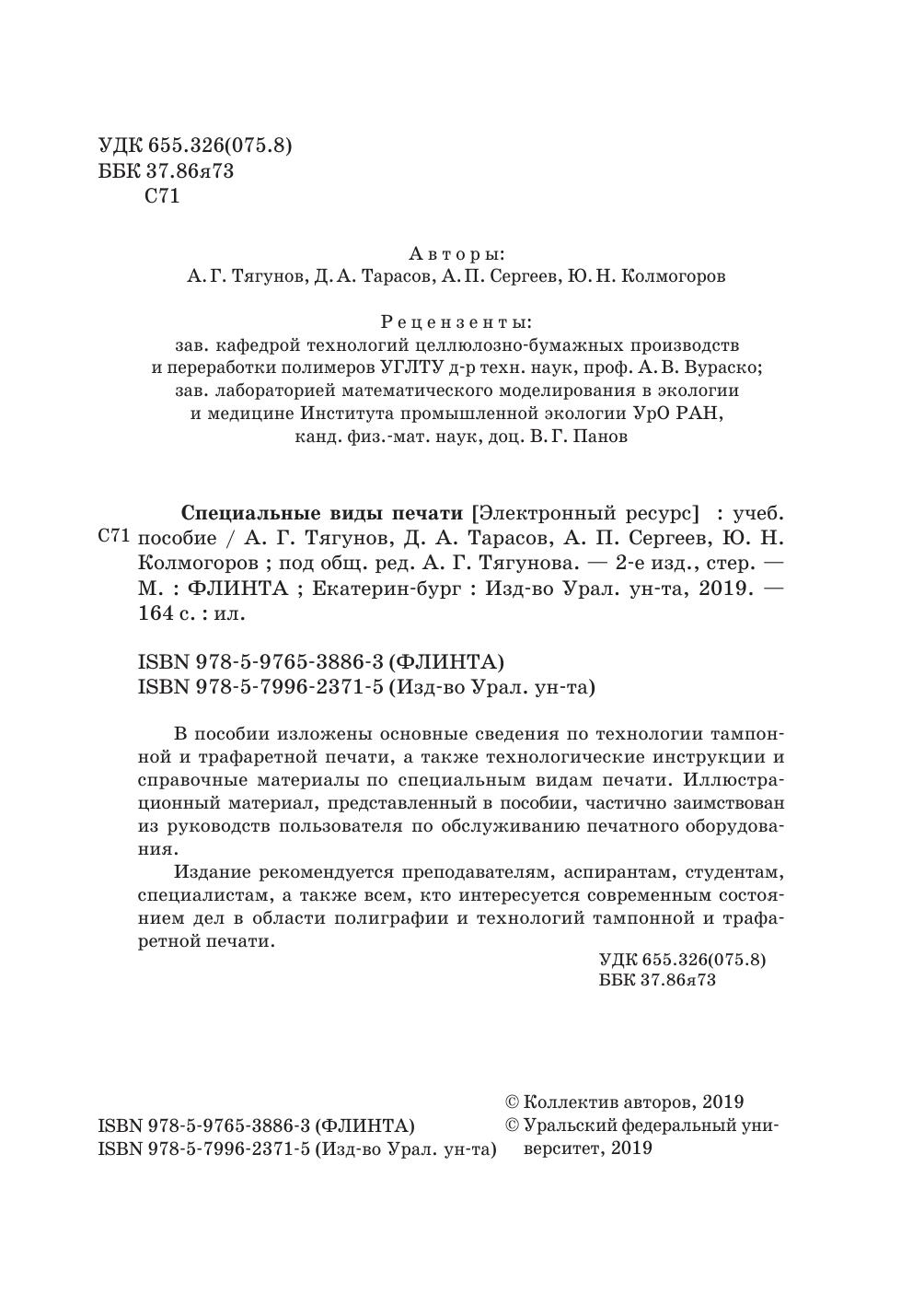 Издание рекомендуется преподавателям, аспирантам, студентам, специалистам, а также всем, кто интересуется современным состоянием дел в области полиграфии и технологий тампонной и трафаретной печати.