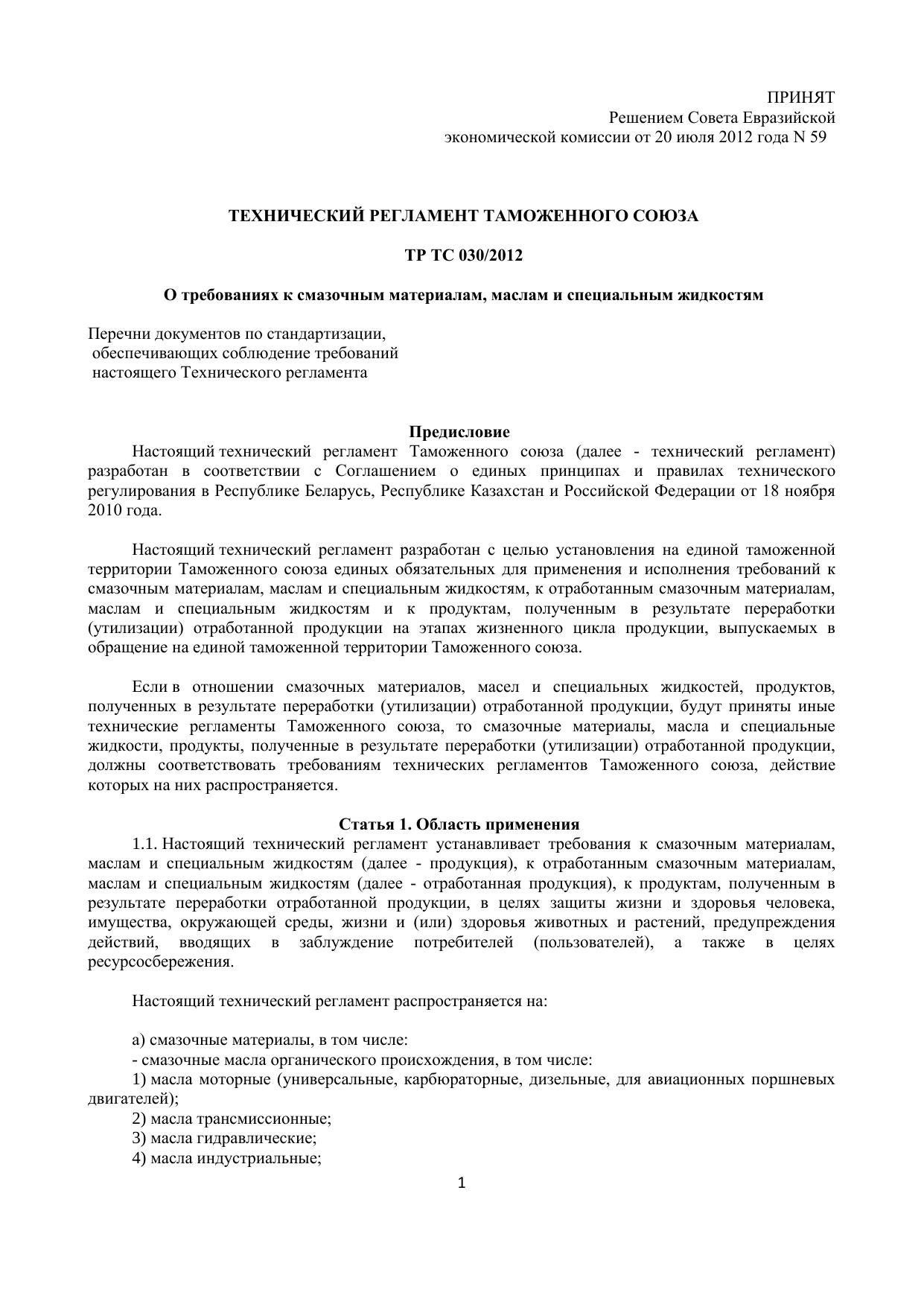 Технический регламент Таможенного союза О требованиях к смазочным материалам, маслам и специальным жидкостям. ТР ТС 030/2012