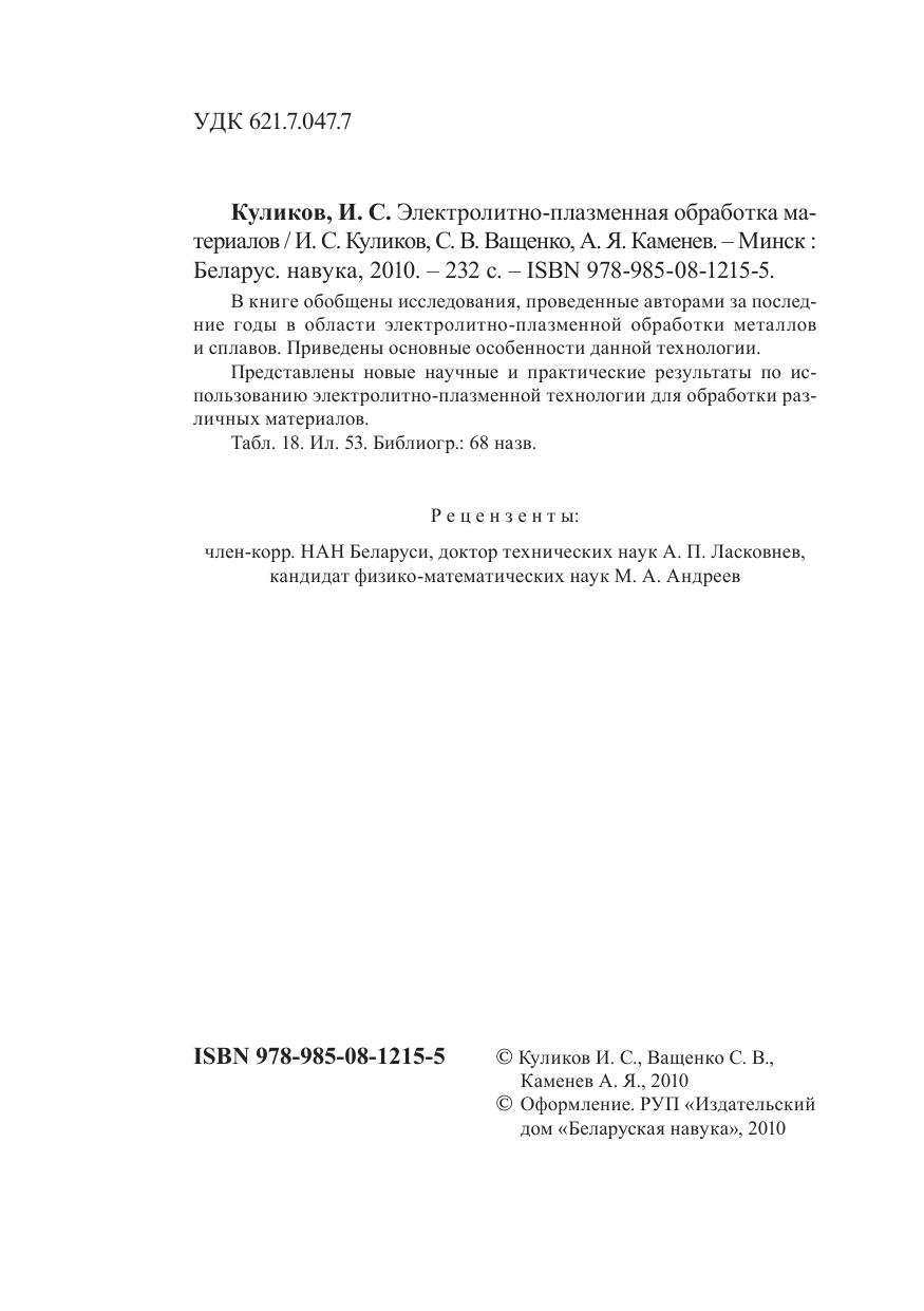 В книге обобщены исследования, проведенные авторами за последние годы в области электролитно-плазменной обработки металлов и сплавов. Приведены основные особенности данной технологии. Представлены новые научные и практические результаты по использованию электролитно-плазменной технологии для обработки различных материалов.