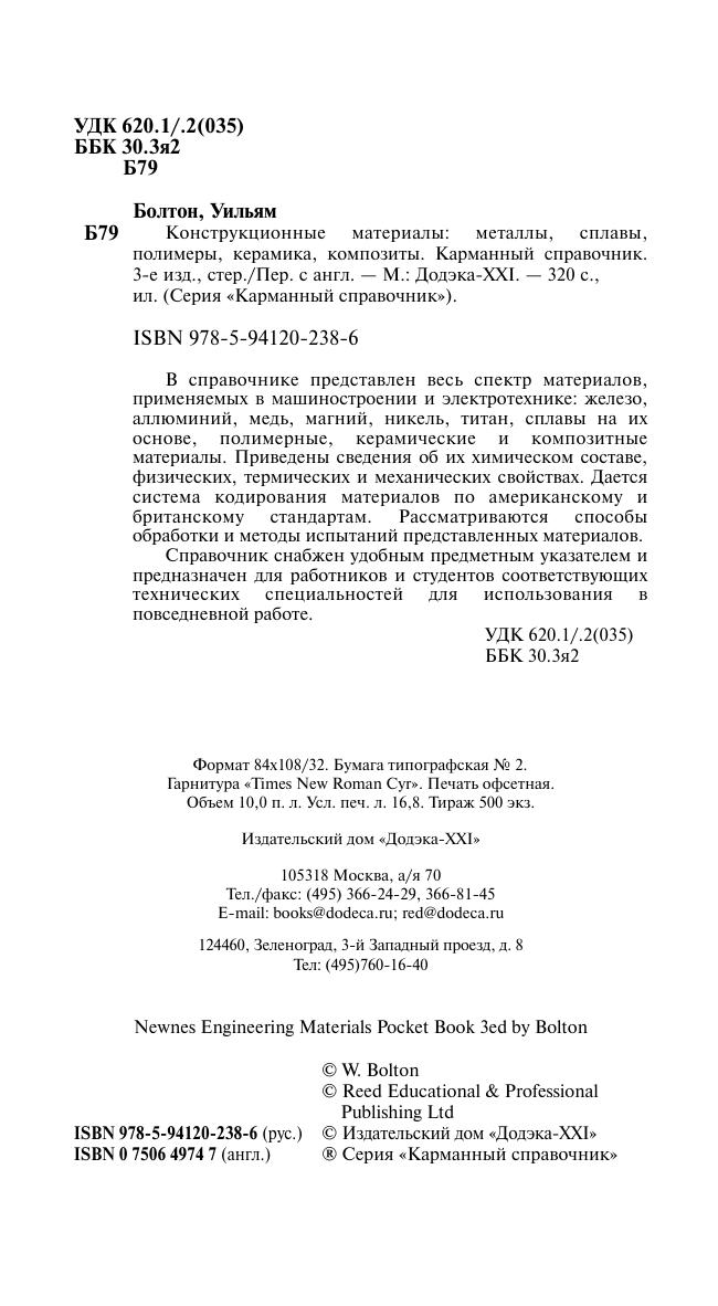 В справочнике представлен весь спектр материалов, применяемых в машиностроении и электротехнике: железо, аллюминий, медь, магний, никель, титан, сплавы на их основе, полимерные, керамические и композитные материалы. Приведены сведения об их химическом составе, физических, термических и механических свойствах. Дается система кодирования материалов по американскому и британскому стандартам. Рассматриваются способы обработки и методы испытаний представленных материалов. Справочник снабжен удобным предметным указателем и предназначен для работников и студентов соответствующих технических специальностей для использования в повседневной работе.
