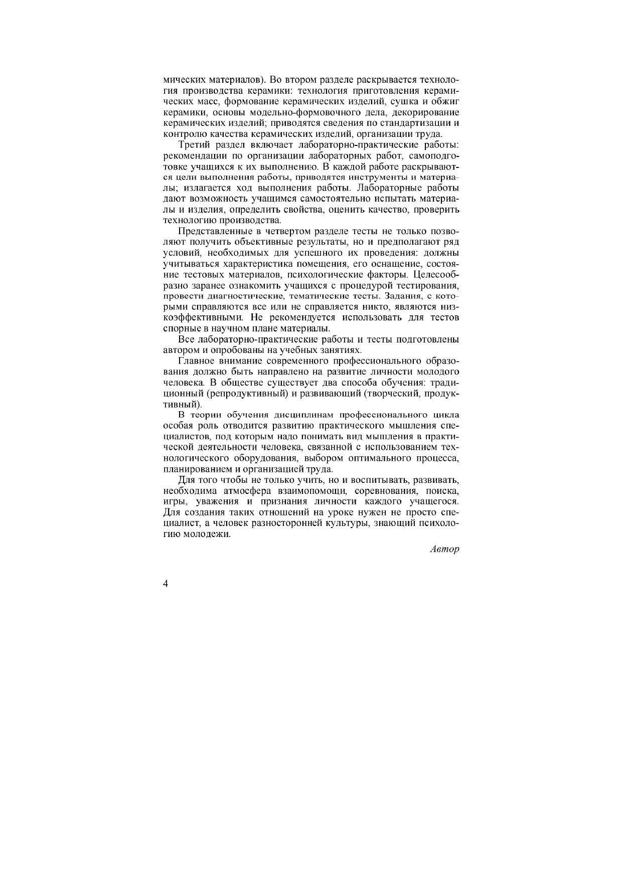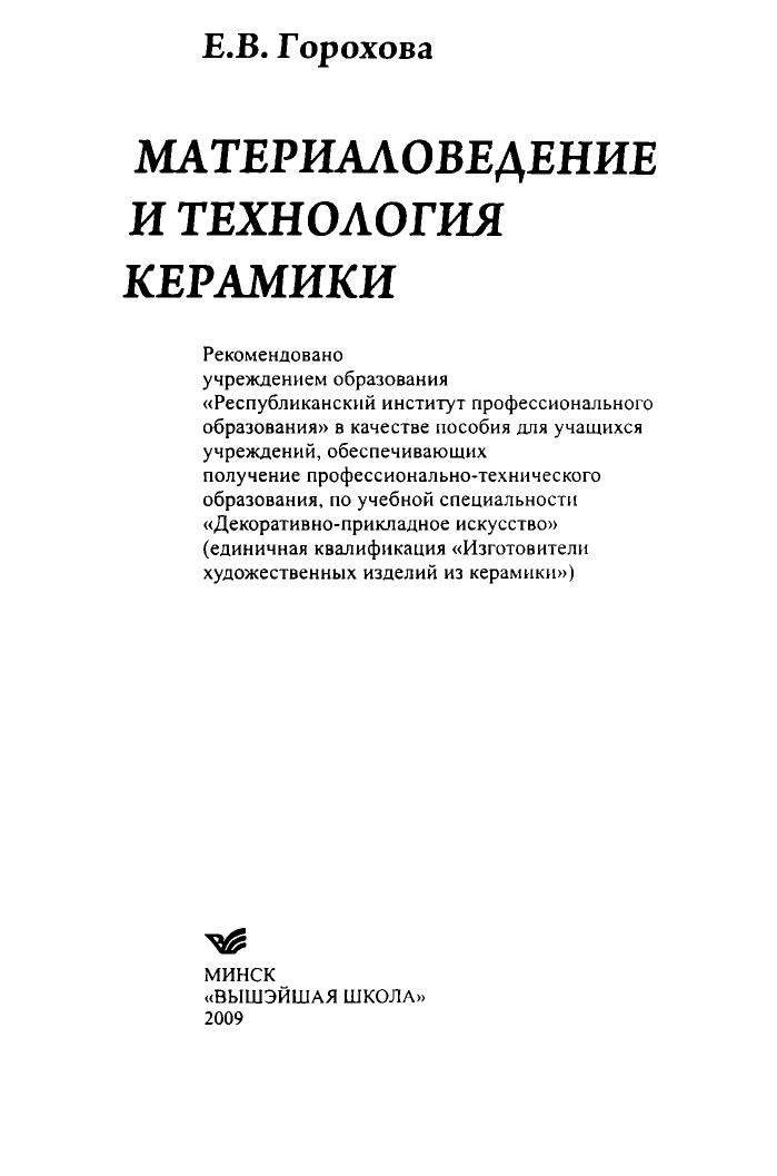 Изложены сведения о материалах, используемых для изготовления керамических изделий технология керамики. Дана характеристика и рецептура керамических масс, материалов декорирования. Содержатся лабораторно-практические задания и тесты. Для учащихся ПТУ по учебной специальности «Декоративно-прикладное искусство».