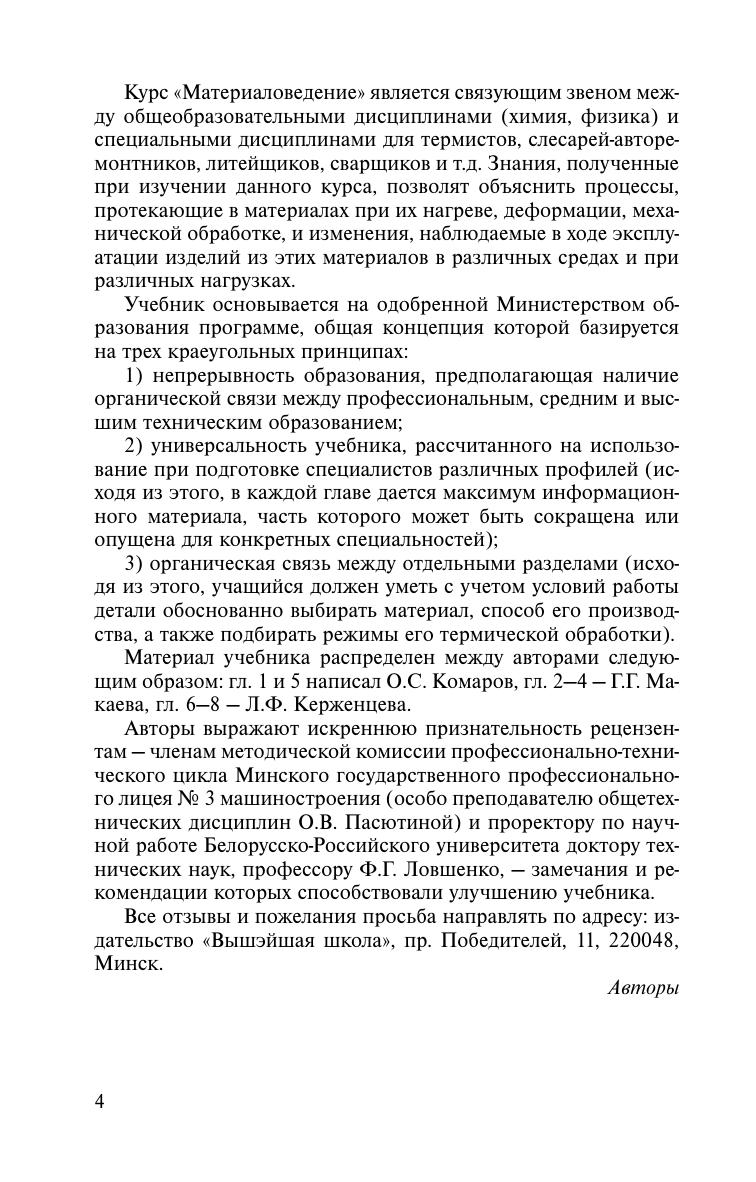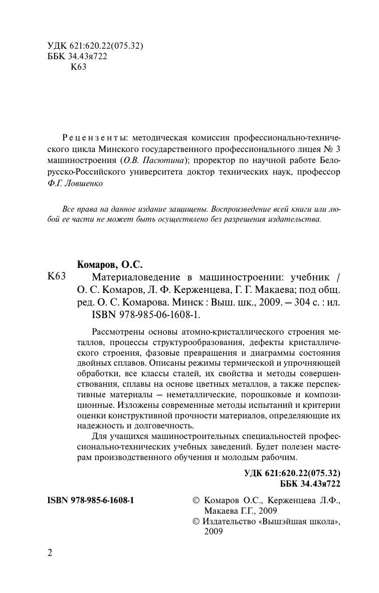 Рассмотрены основы атомно-кристаллического строения металлов, процессы структурообразования, дефекты кристаллического строения, фазовые превращения и диаграммы состояния двойных сплавов. Описаны режимы термической и упрочняющей обработки, все классы сталей, их свойства и методы совершенствования, сплавы на основе цветных металлов, а также перспективные материалы - неметаллические, порошковые и композиционные. Изложены современные методы испытаний и критерии оценки конструктивной прочности материалов, определяющие их надежность и долговечность. Для учащихся машиностроительных специальностей ПТУ. Будет полезен мастерам производственного обучения и молодым рабочим.