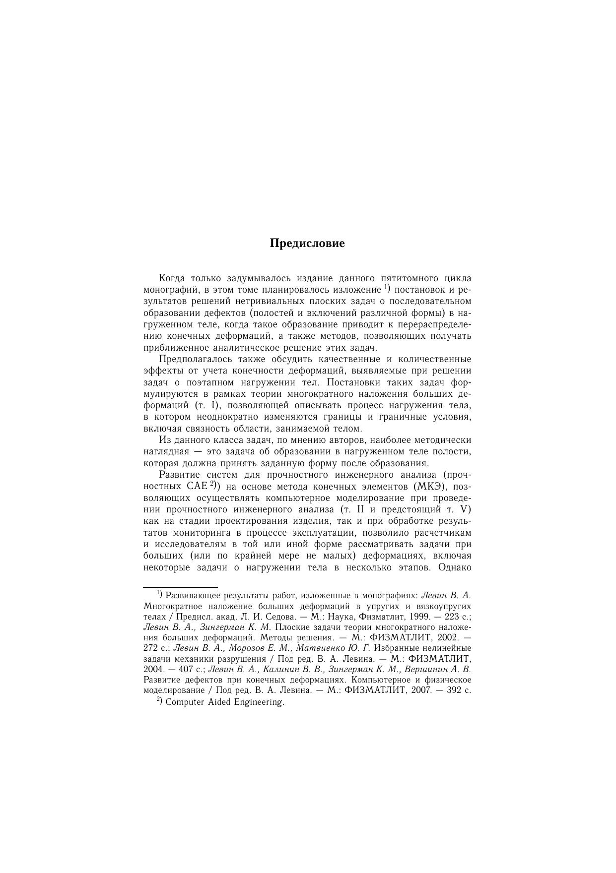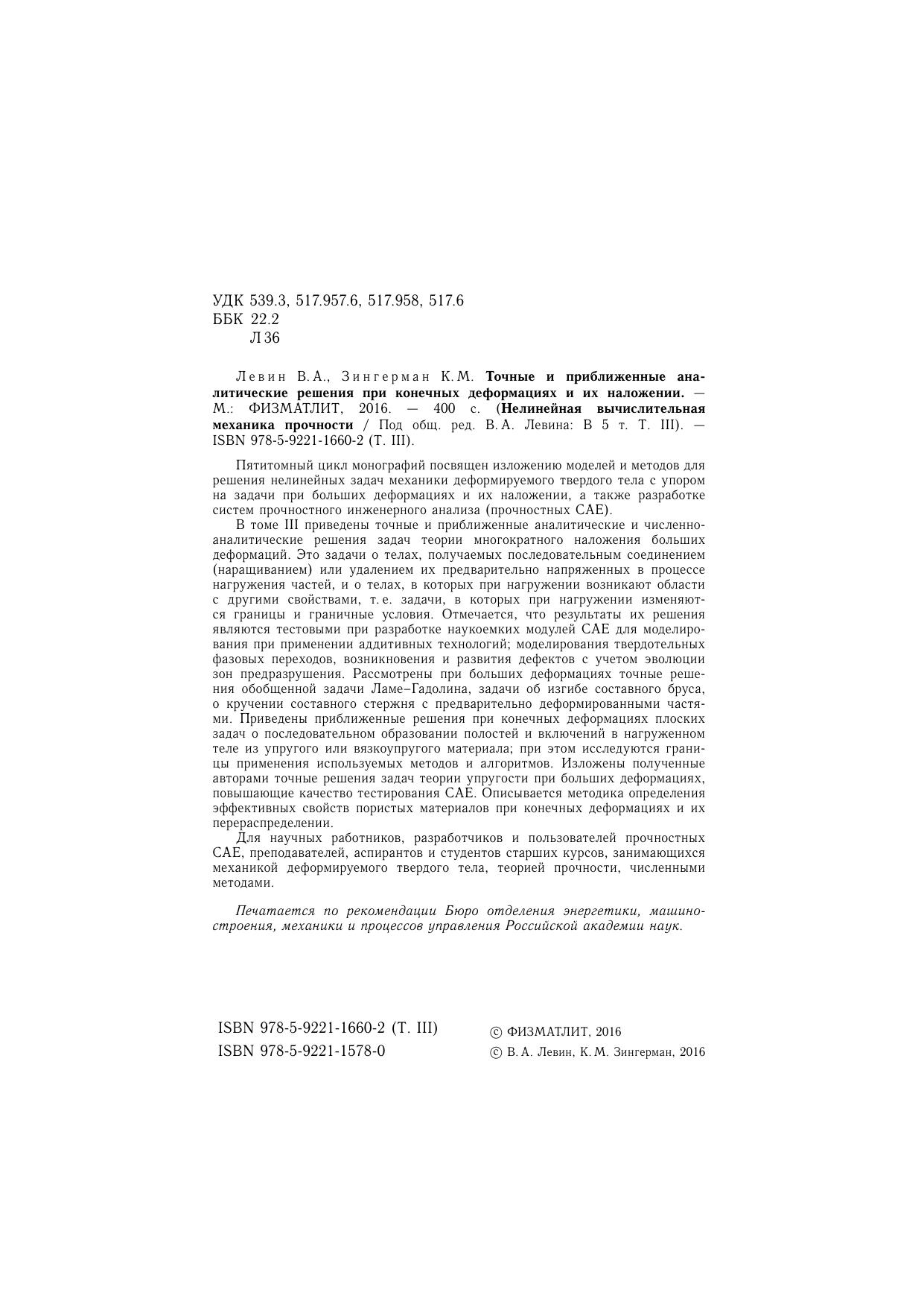 Пятитомный цикл монографий посвящен изложению моделей и методов для решения нелинейных задач механики деформируемого твердого тела с упором на задачи при больших деформациях и их наложении, а также разработке систем прочностного инженерного анализа (прочностных САЕ). В томе III приведены точные и приближенные аналитические и численно-аналитические решения задач теории многократного наложения больших деформаций. Это задачи о телах, получаемых последовательным соединением (наращиванием) или удалением их предварительно напряженных в процессе нагружения частей, и о телах, в которых при нагружении возникают области с другими свойствами, т.е. задачи, в которых при нагружении изменяются границы и граничные условия. Отмечается, что результаты их решения являются тестовыми при разработке наукоемких модулей САЕ для моделирования при применении аддитивных технологий; моделирования твердотельных фазовых переходов, возникновения и развития дефектов с учетом эволюции зон предразрушения. Рассмотрены при больших деформациях точные решения обобщенной задачи Ламе–Гадолина, задачи об изгибе составного бруса, о кручении составного стержня с предварительно деформированными частями. Приведены приближенные решения при конечных деформациях плоских задач о последовательном образовании полостей и включений в нагруженном теле из упругого или вязкоупругого материала; при этом исследуются границы применения используемых методов и алгоритмов. Изложены полученные авторами точные решения задач теории упругости при больших деформациях, повышающие качество тестирования САЕ. Описывается методика определения эффективных свойств пористых материалов при конечных деформациях и их перераспределении.