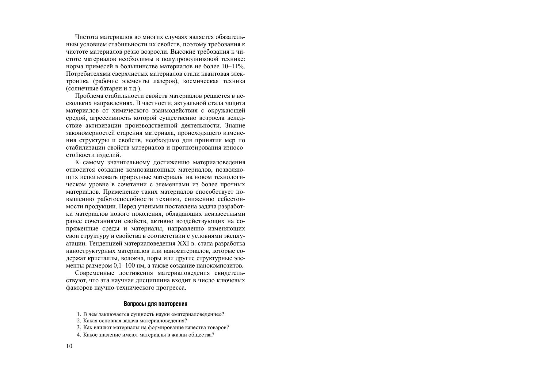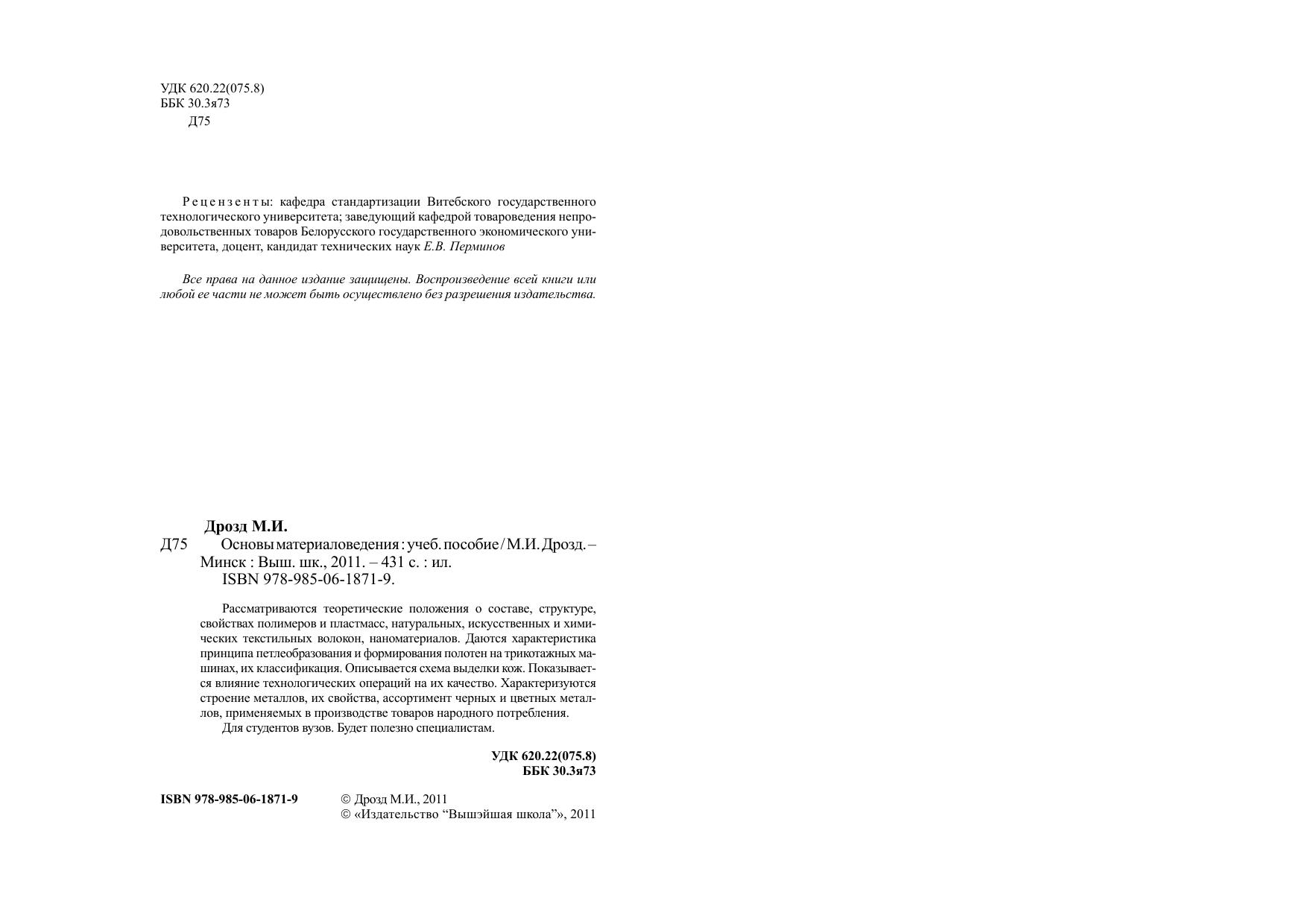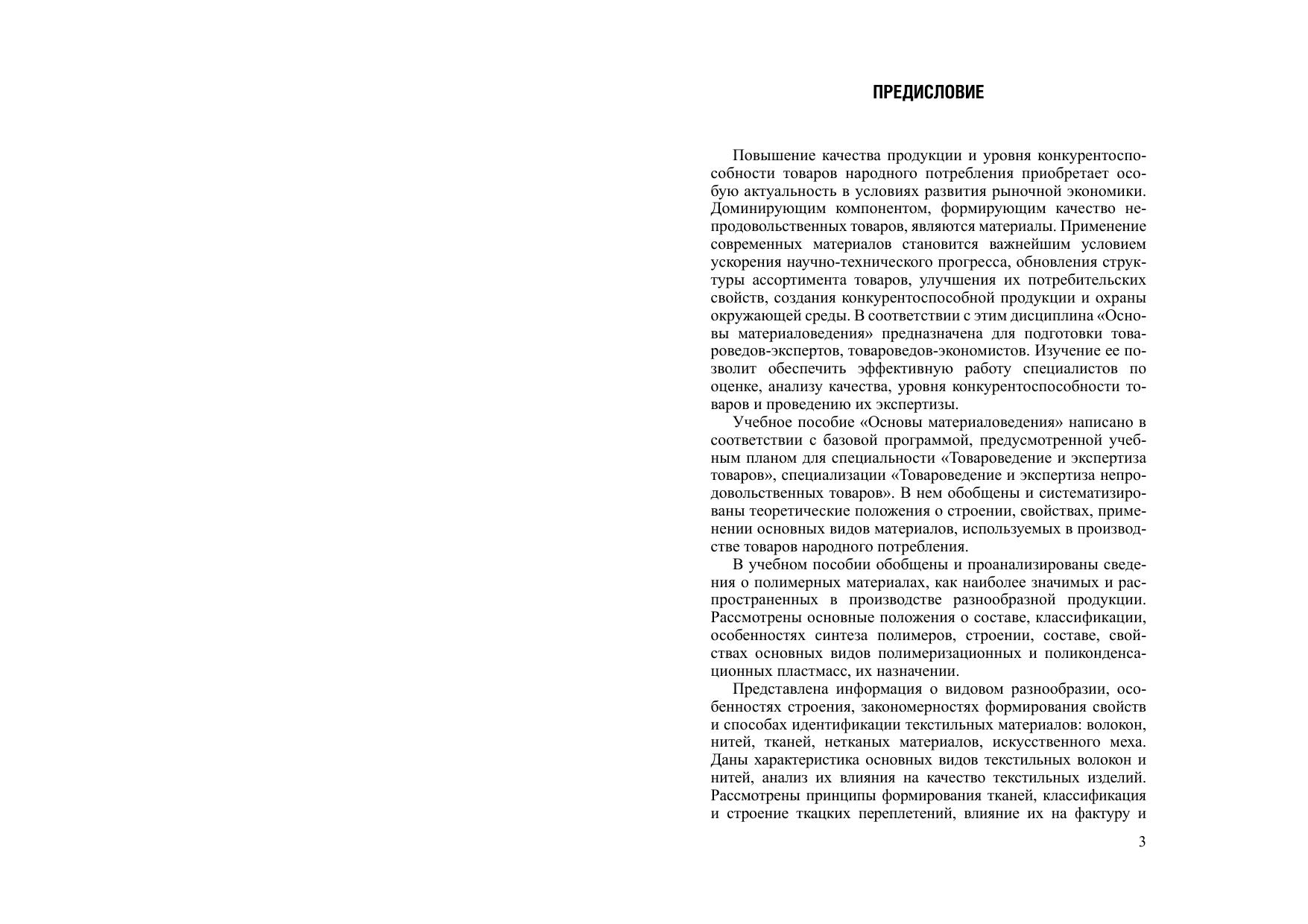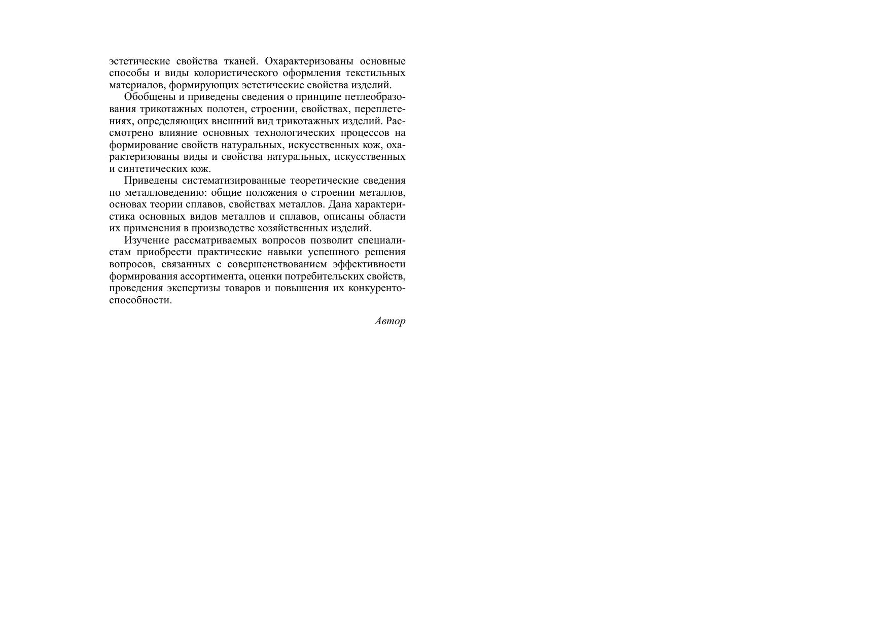 Рассматриваются теоретические положения о составе, структуре, свойствах полимеров и пластмасс, натуральных, искусственных и химических текстильных волокон, наноматериалов. Даются характеристика принципа петлеобразования и формирования полотен на трикотажных машинах, их классификация. Описывается схема выделки кож. Показывается влияние технологических операций на их качество. Характеризуются строение металлов, их свойства, ассортимент черных и цветных металлов, применяемых в производстве товаров народного потребления. Для студентов вузов. Будет полезно специалистам.