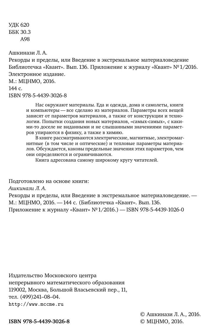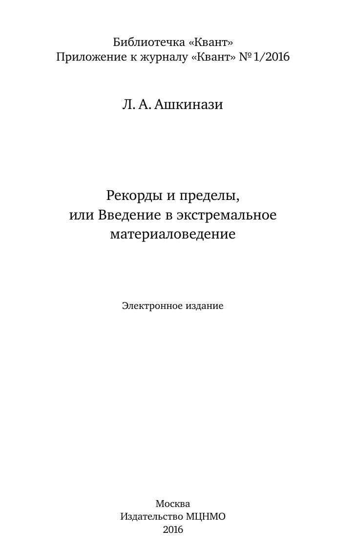Рекорды и пределы, или Введение в экстремальное материаловедение. Библиотечка «Квант» выпуск 136. Приложение к журналу «Квант» №1/2016