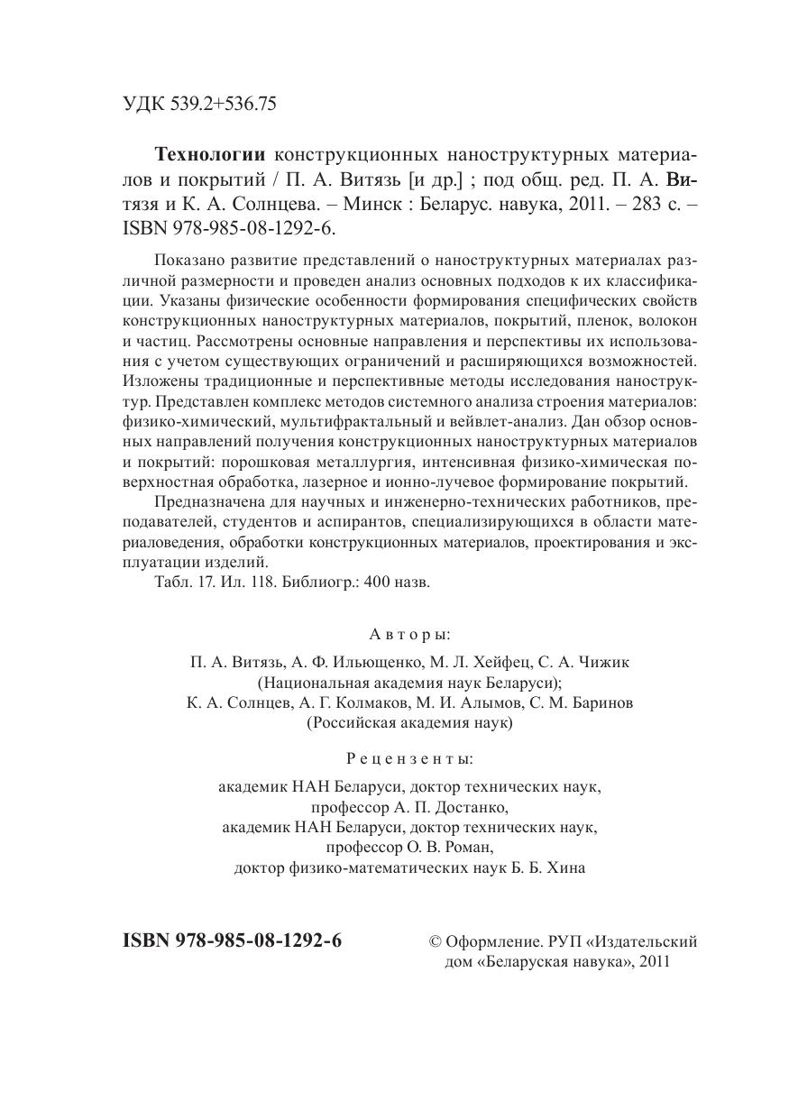 Показано развитие представлений о наноструктурных материалах различной размерности и проведен анализ основных подходов к их классификации. Указаны физические особенности формирования специфических свойств конструкционных наноструктурных материалов, покрытий, пленок, волокон и частиц. Рассмотрены основные направления и перспективы их использования с учетом существующих ограничений и расширяющихся возможностей. Изложены традиционные и перспективные методы исследования наноструктур. Представлен комплекс методов системного анализа строения материалов: физико-химический, мультифрактальный и вейвлет-анализ. Дан обзор основных направлений получения конструкционных наноструктурных материалов и покрытий: порошковая металлургия, интенсивная физико-химическая поверхностная обработка, лазерное и ионно-лучевое формирование покрытий. Предназначена для научных и инженерно-технических работников, преподавателей, студентов и аспирантов, специализирующихся в области материаловедения, обработки конструкционных материалов, проектирования и эксплуатации изделий.