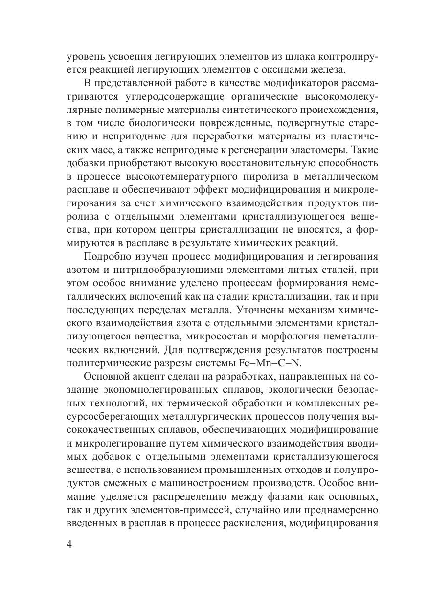 Обобщены результаты многолетних исследований по созданию экономнолегированных сплавов, экологически безопасных технологий их термической обработки и комплексных ресурсосберегающих металлургических технологий получения высококачественных сплавов, обеспечивающих модифицирование и микролегирование путем химического взаимодействия вводимых добавок с отдельными элементами кристаллизующегося вещества, с использованием промышленных отходов и полупродуктов смежных с машиностроением производств. Изучены и теоретически обобщены особенности структурообразования и свойства железоуглеродистых сплавов, в том числе характер распределения между фазами как основных, так и ряда других элементовпри месей, случайно или преднамеренно введенных в расплав в процессе раскисления, модифицирования или микролегирования, микросостав и природа неметаллических включений. Монография предназначена для научных сотрудников, инженерно-технических работников предприятий машиностроительного и металлургического профиля, а также аспирантов, магистрантов и студентов.