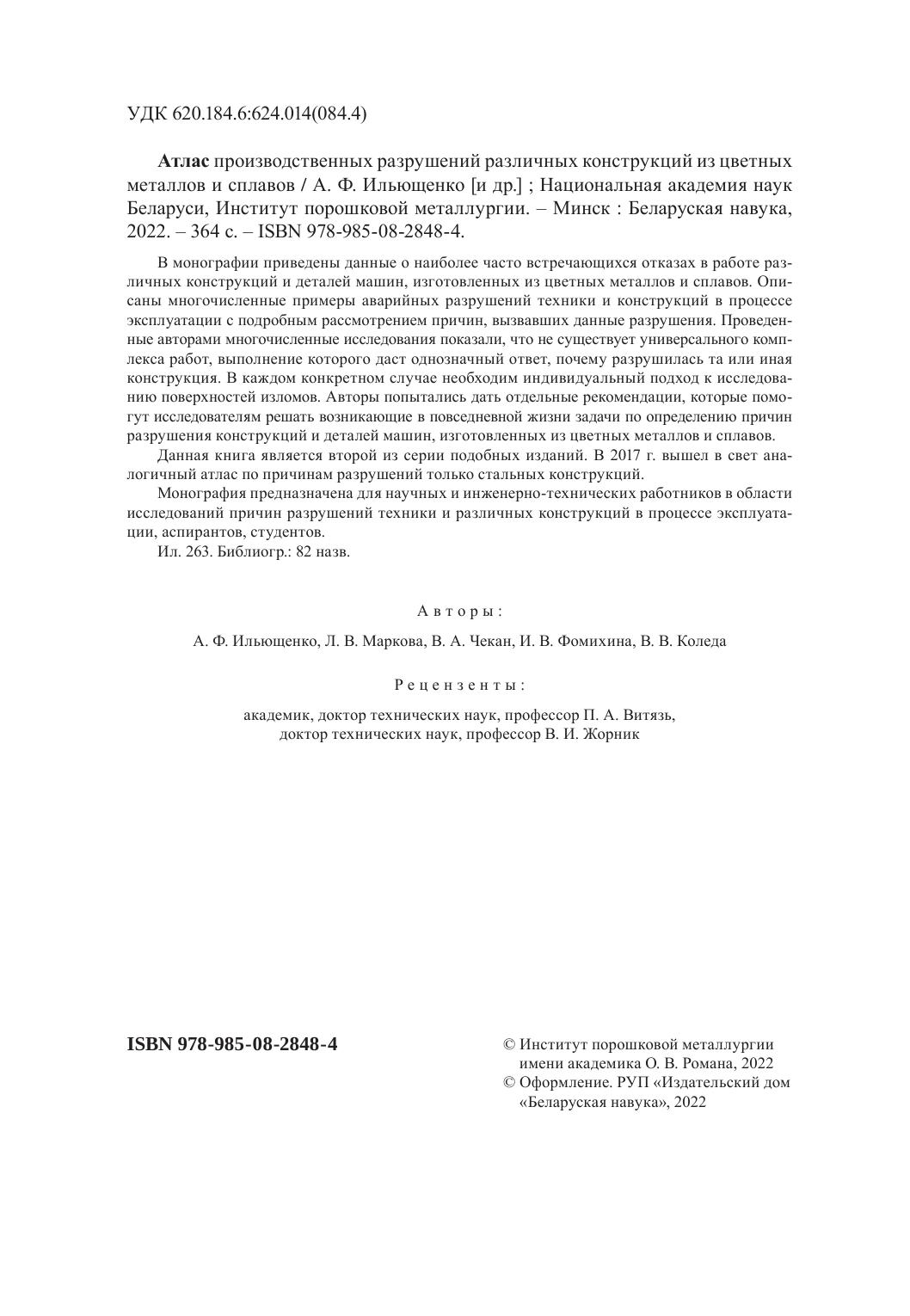 В монографии приведены данные о наиболее часто встречающихся отказах в работе различных конструкций и деталей машин, изготовленных из цветных металлов и сплавов. Описаны многочисленные примеры аварийных разрушений техники и конструкций в процессе эксплуатации с подробным рассмотрением причин, вызвавших данные разрушения. Проведенные авторами многочисленные исследования показали, что не существует универсального комплекса работ, выполнение которого даст однозначный ответ, почему разрушилась та или иная конструкция. В каждом конкретном случае необходим индивидуальный подход к исследованию поверхностей изломов. Авторы попытались дать отдельные рекомендации, которые помогут исследователям решать возникающие в повседневной жизни задачи по определению причин разрушения конструкций и деталей машин, изготовленных из цветных металлов и сплавов.