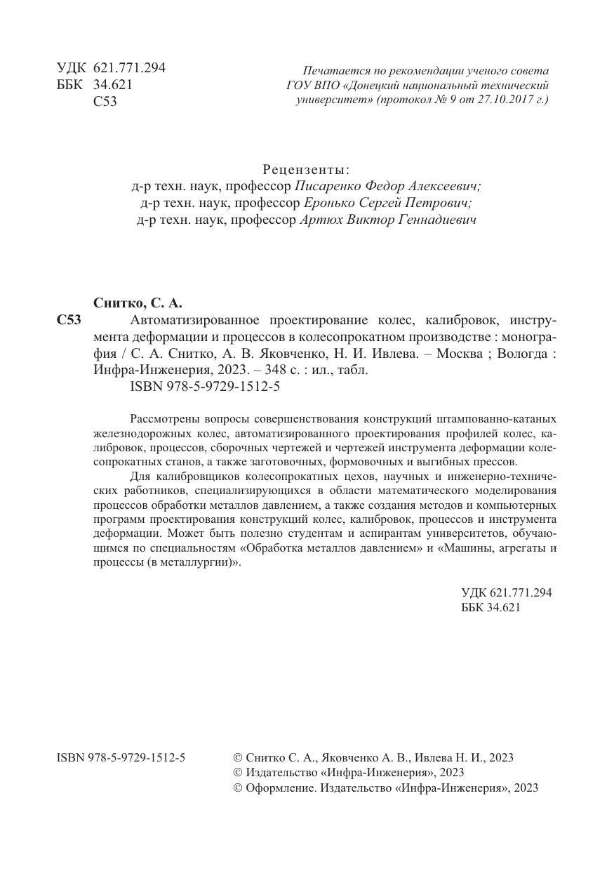 Для калибровщиков колесопрокатных цехов, научных и инженерно-технических работников, специализирующихся в области математического моделирования процессов обработки металлов давлением, а также создания методов и компьютерных программ проектирования конструкций колес, калибровок, процессов и инструмента деформации. Может быть полезно студентам и аспирантам университетов, обучающимся по специальностям «Обработка металлов давлением» и «Машины, агрегаты и процессы (в металлургии)».