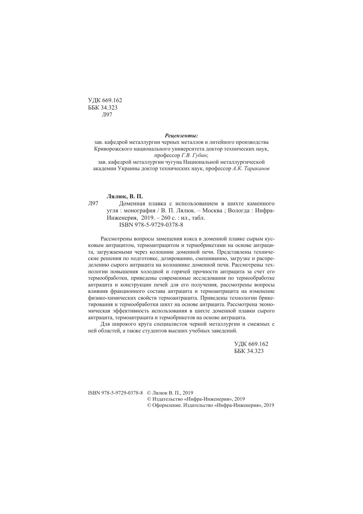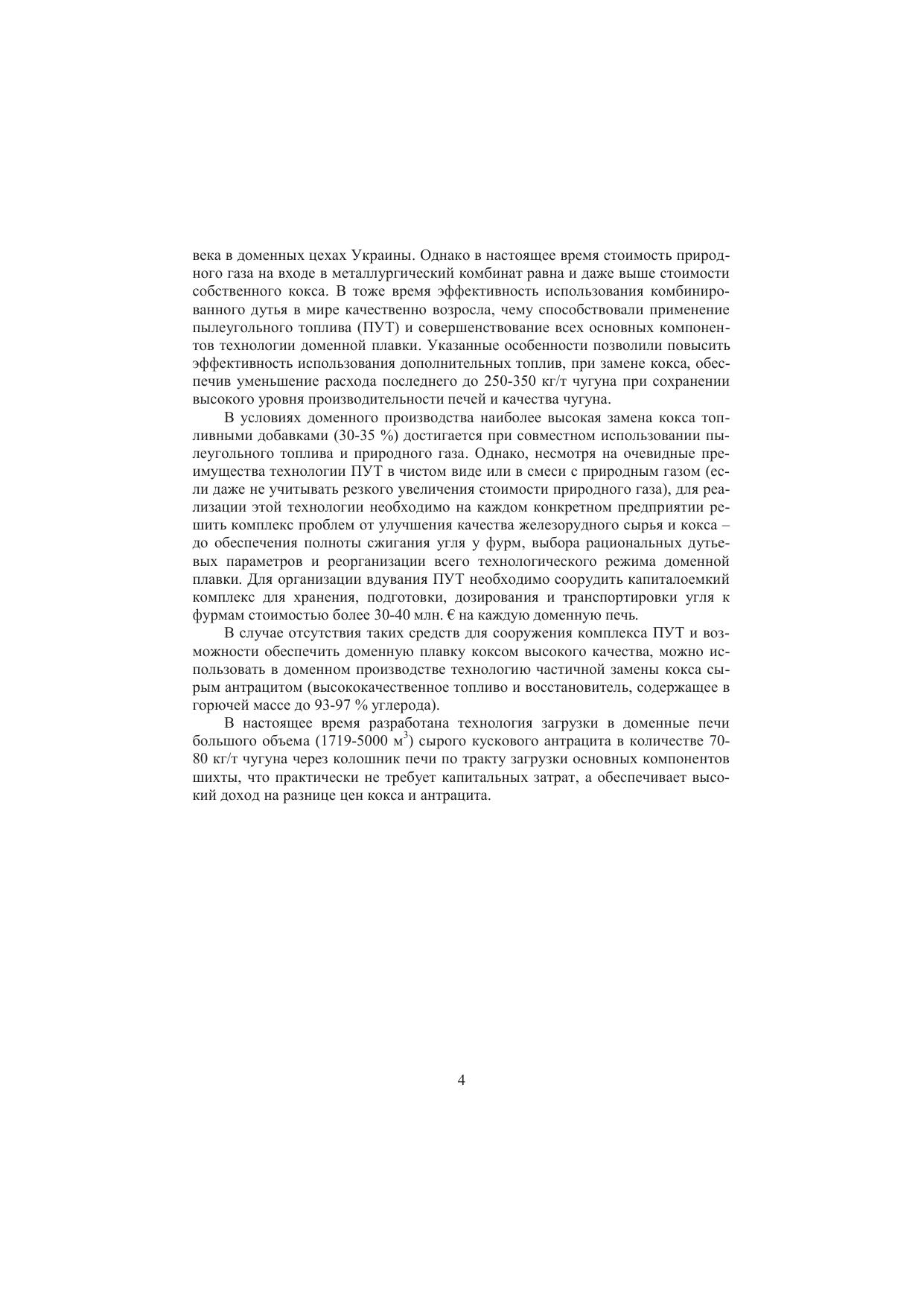 Рассмотрены вопросы замещения кокса в доменной плавке сырым кусковым антрацитом, термоантрацитом и термобрикетами на основе антрацита, загружаемыми через колошник доменной печи. Представлены технические решения по подготовке, дозированию, смешиванию, загрузке и распределению сырого антрацита на колошнике доменной печи. Рассмотрены технологии повышения холодной и горячей прочности антрацита за счет его термообработки, приведены современные исследования по термообработке антрацита и конструкции печей для его получения, рассмотрены вопросы влияния фракционного состава антрацита и термоантрацита на изменение физико-химических свойств термоантрацита. Приведены технологии брикетирования и термообработки шихт на основе антрацита. Рассмотрена экономическая эффективность использования в шихте доменной плавки сырого антрацита, термоантрацита и термобрикетов на основе антрацита.