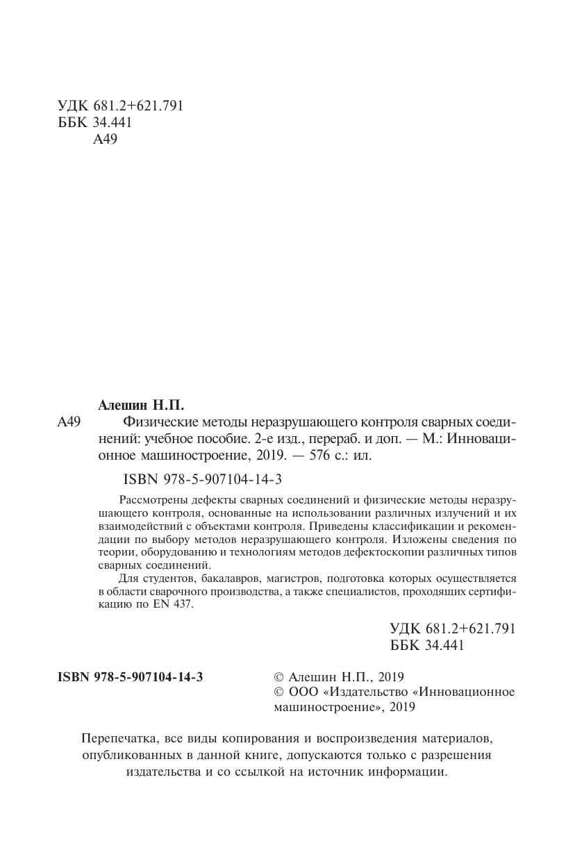 Рассмотрены дефекты сварных соединений и физические методы неразрушающего контроля, основанные на использовании различных излучений и их взаимодействий с объектами контроля. Приведены классификации и рекомендации по выбору методов неразрушающего контроля. Изложены сведения по теории, оборудованию и технологиям методов дефектоскопии различных типов сварных соединений. Для студентов, бакалавров, магистров, подготовка которых осуществляется в области сварочного производства, а также специалистов, проходящих сертификацию по EN 437