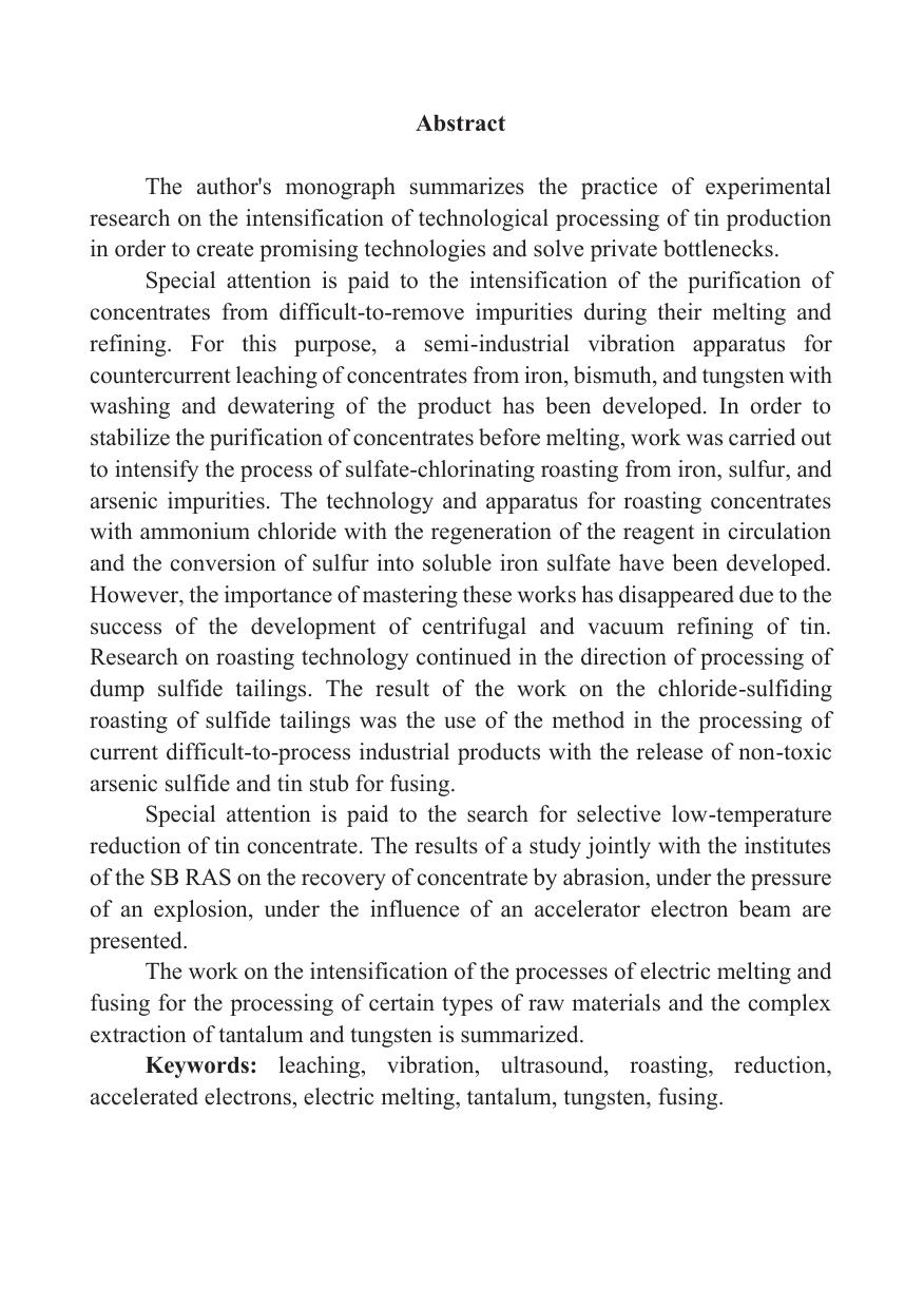 Монография касается поиска вариантов селективного низкотемператур-ного восстановления оловянного концентрата, и в частности под воздействием пучка электронов ускорителя и фьюмингования шлаков в струе плазмы.