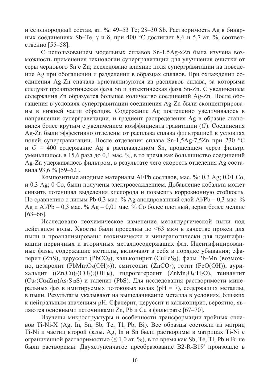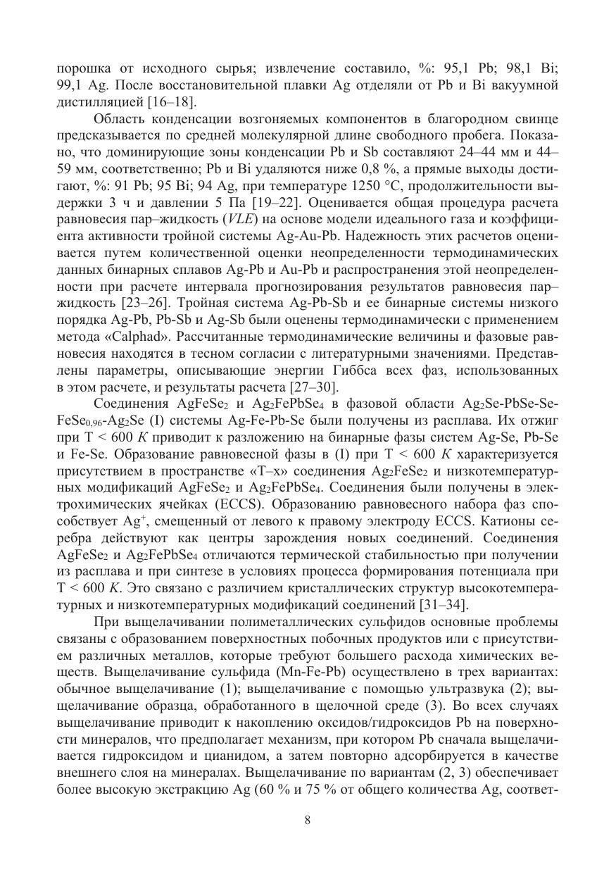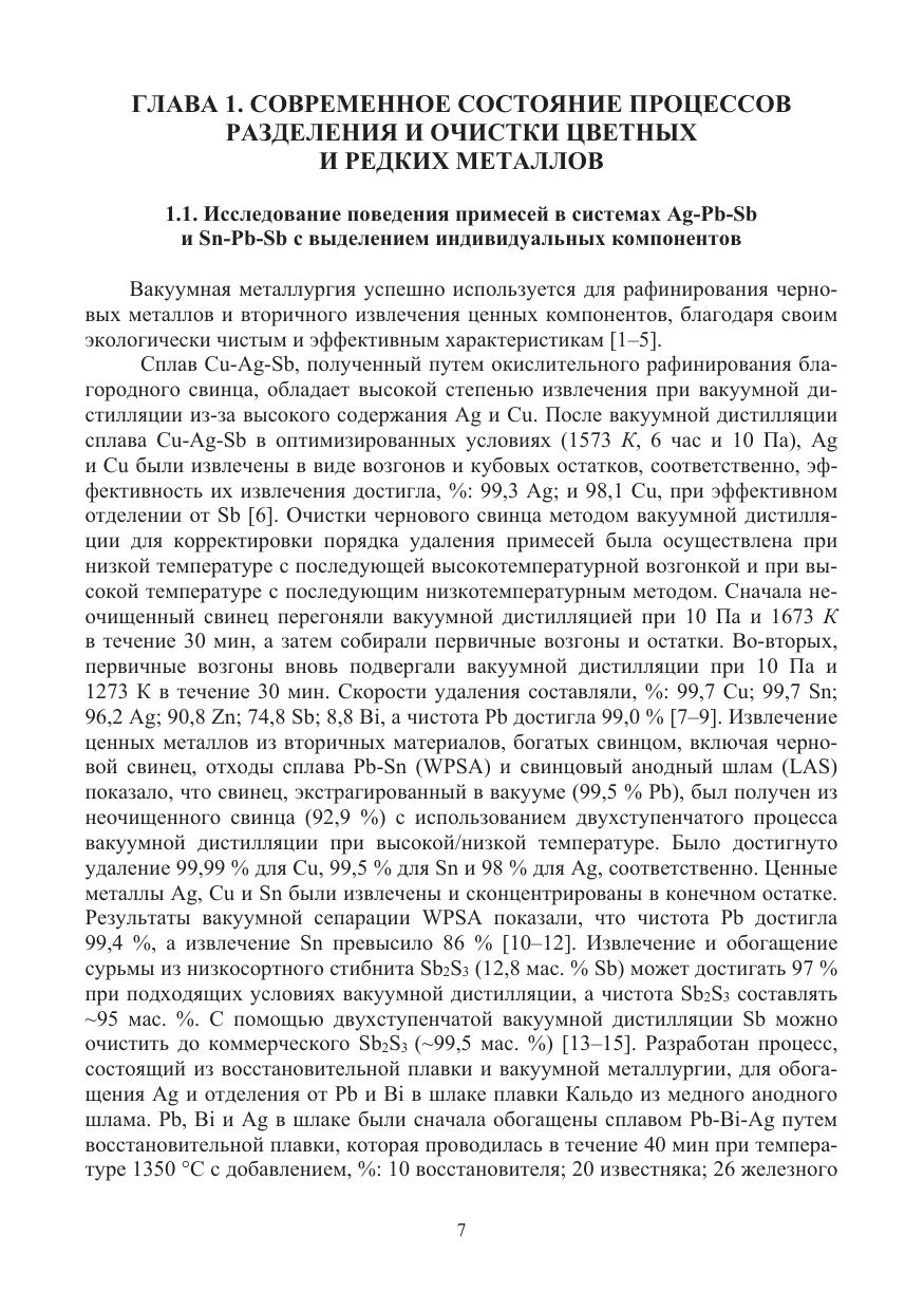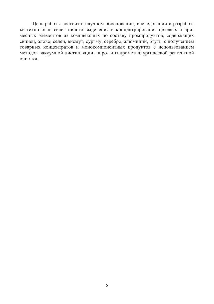 Рассмотрены технологии селективного выделения и концентрирования целевых и примесных элементов из комплексных по составу промпродуктов, содержащих свинец, олово, селен, висмут, сурьму, серебро, алюминий, ртуть, с получением товарных концентратов и монокомпонентных продуктов с использованием методов вакуумной дистилляции, пиро- и гидрометаллургической реагентной очистки.