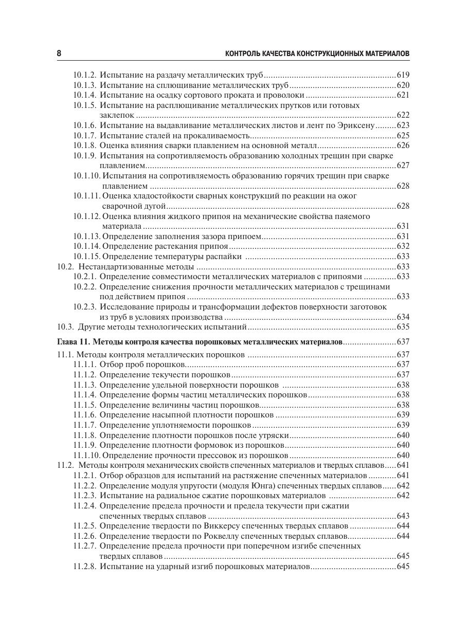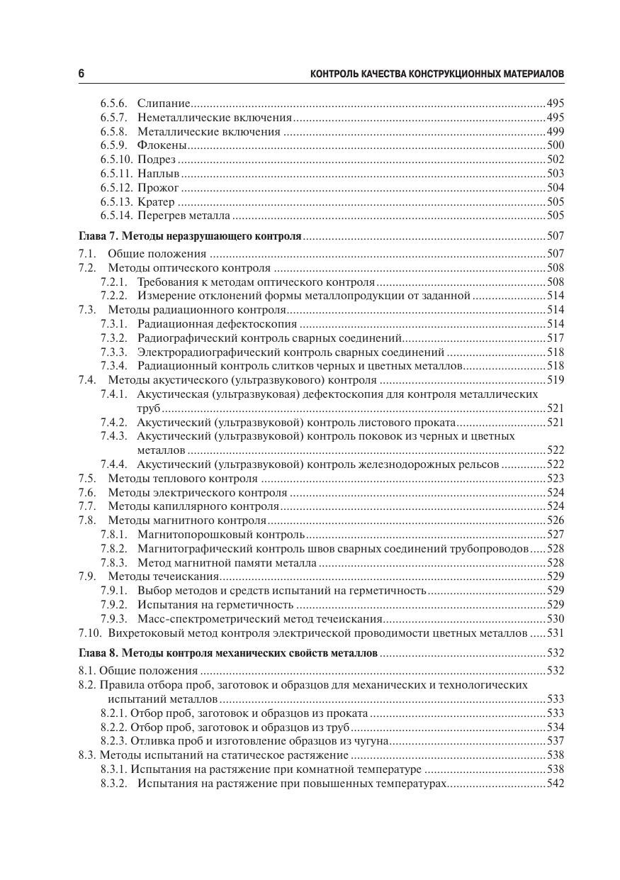 Обобщены результаты научно-исследовательских и производственных работ в области металловедения. Подробно описаны современные стандартные (с указанием ГОСТов) и нестандартные методы контроля механических, технологических, физических, коррозионных свойств, химического состава материалов, качества покрытий, износостойкости конструкционных металлических материалов (стали, чугуны, алюминиевые, медные, никелевые, титановые, магниевые сплавы, порошковые и наноматериалы), их сварных и паяных соединений. Систематизированы сведения о характерных дефектах конструкционных металлов (стали, алюминиевые, титановые, никелевые сплавы). Приведен атлас-классификатор изломов конструкционных сталей. Описаны морфология дефектов, условия и причины их образования, способы предупреждения или исправления, влияние на свойства. Даны схемы диагностики причин разрушения деталей в условиях эксплуатации.