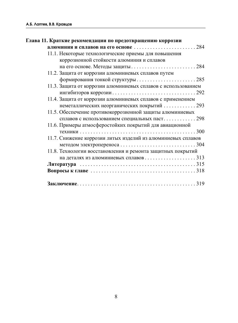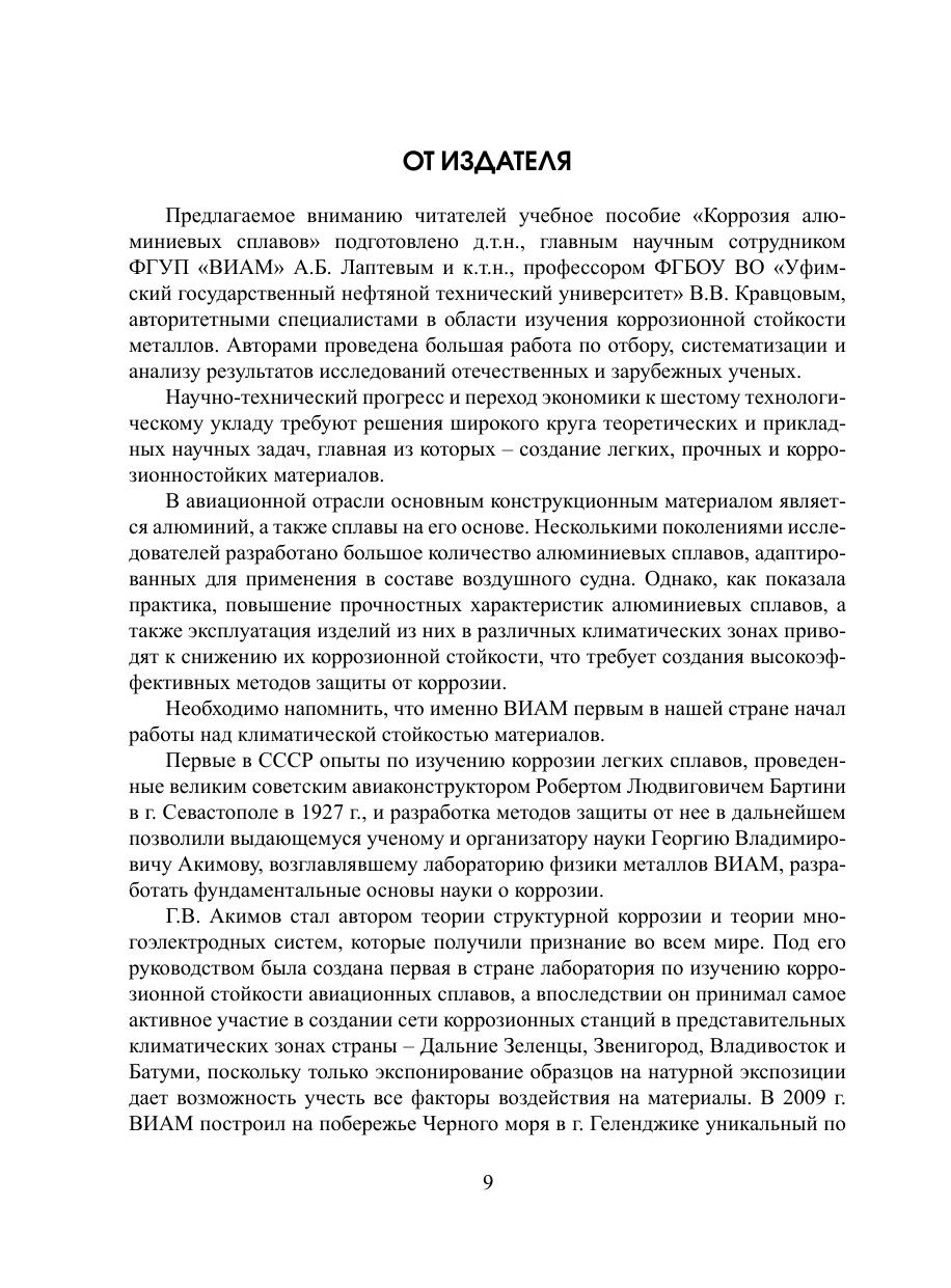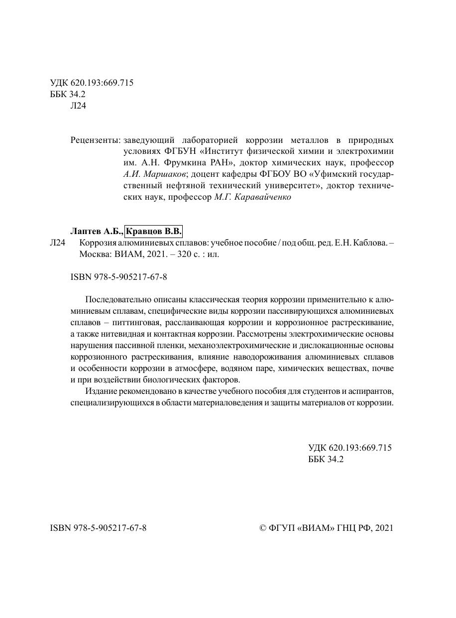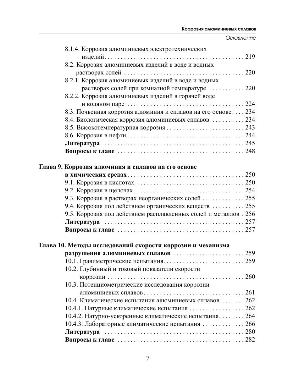 Последовательно описаны классическая теория коррозии применительно к алюминиевым сплавам, специфические виды коррозии пассивирующихся алюминиевых сплавов – питтинговая, расслаивающая коррозии и коррозионное растрескивание, а также нитевидная и контактная коррозии. Рассмотрены электрохимические основы нарушения пассивной пленки, механоэлектрохимические и дислокационные основы коррозионного растрескивания, влияние наводороживания алюминиевых сплавов и особенности коррозии в атмосфере, водяном паре, химических веществах, почве и при воздействии биологических факторов.