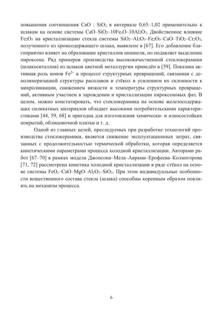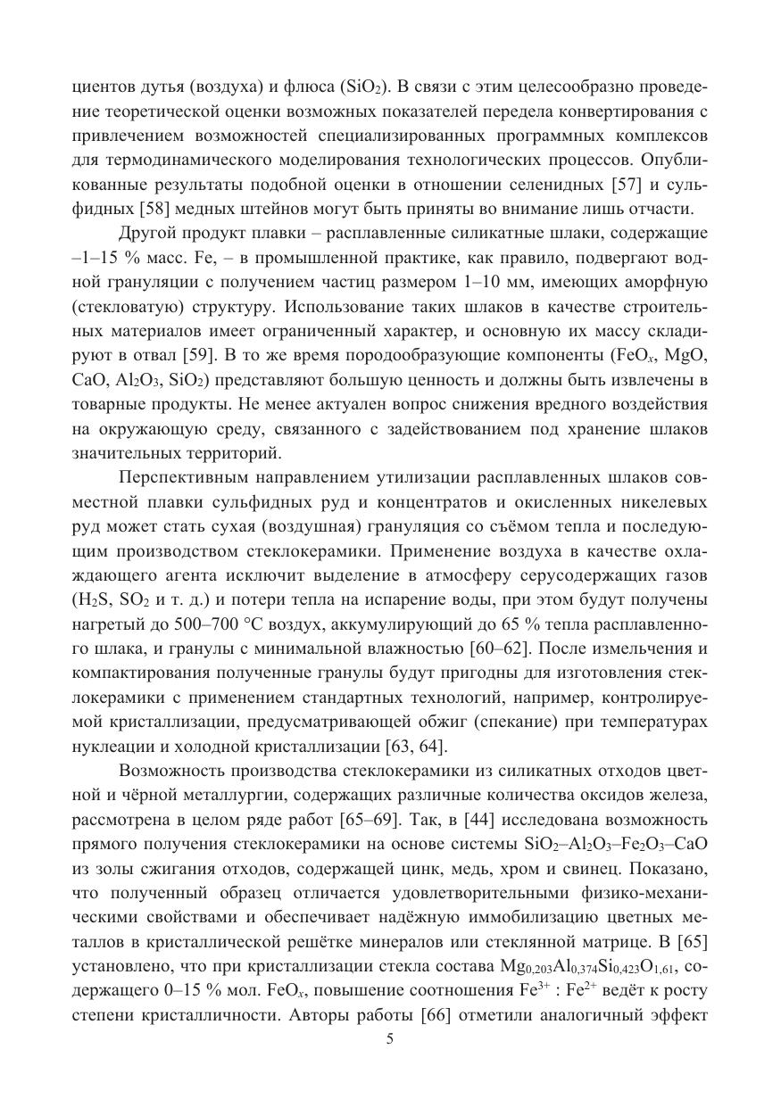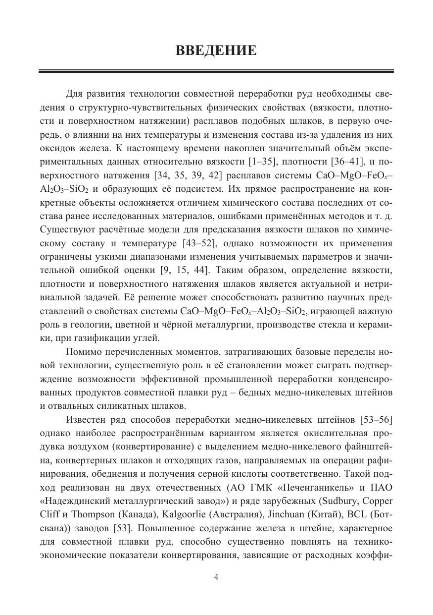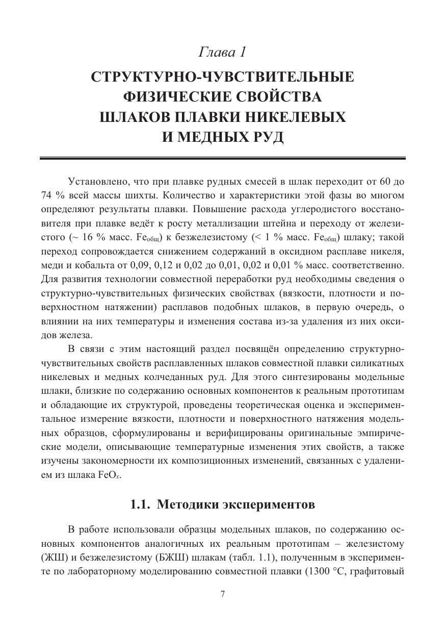 Приведены сведения о структурно-чувствительных физических свойствах (вязкости, плотности и поверхностном натяжении) расплавов шлаков никелевого и медного сырья, в первую очередь, о влиянии на них температуры и изменения состава из-за удаления из них оксидов железа. Представлен значительный объём экспериментальных данных по вязкости, плотности и поверхностному натяжению расплавов системы CaO–MgO–FeOx–Al2O3–SiO2 и образующих её подсистем.