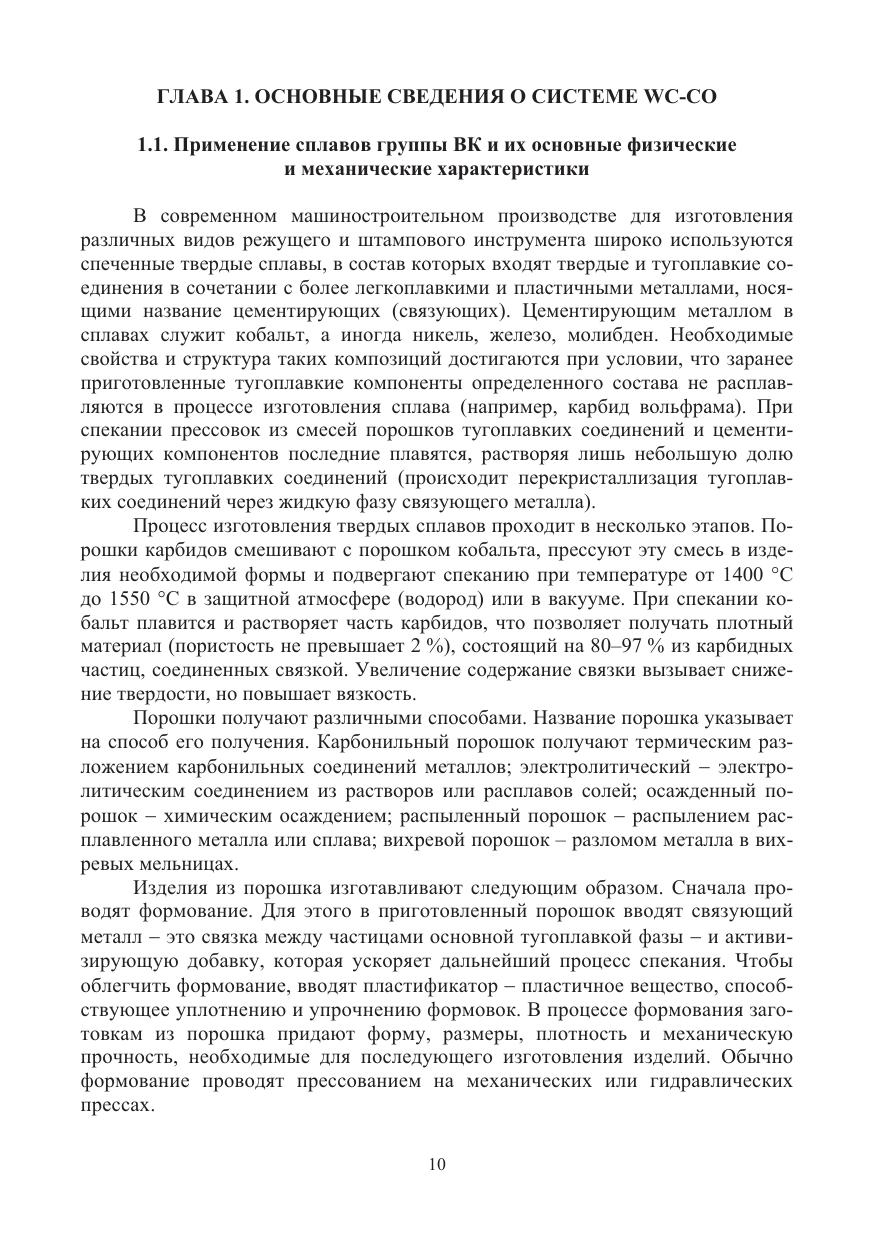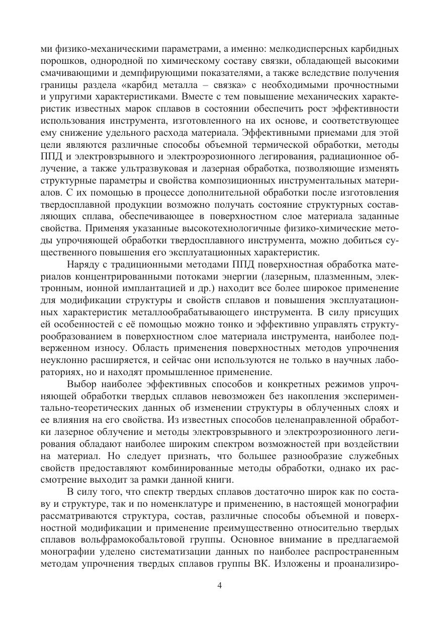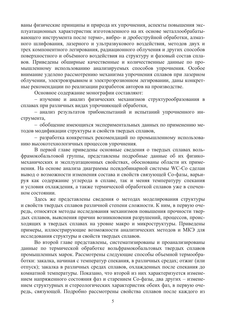 Систематизированы и проанализированы данные по традиционным и перспективным методам упрочняющей обработки широко используемых твердых сплавов вольфрамокобальтовой группы. Изложены физические основы структурообразования в сплавах после термо-, вибро- и дробеструйной обработки, алмазного шлифования, лазерного и ультразвукового воздействия, электроэрозионного упрочнения легированием, электровзрывного легирования, радиационного облучения и других способов поверхностного и объемного воздействия на их структуру и фазовый состав. Проанализирована природа упрочнения спеченных твердых сплавов и аспекты повышения эксплуатационных характеристик изготовленного на их основе металлообрабатывающего инструмента. Обоснованы режимы его упрочнения и эксплуатации. Представлены методы моделирования структуры и свойств твердых сплавов различной степени сложности, применяемые для решения различного круга задач. Приведены результаты практического использования анализируемых способов упрочнения.