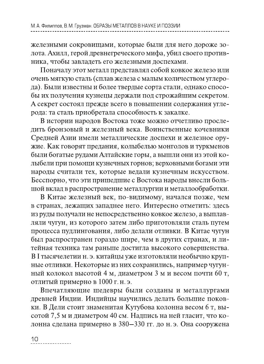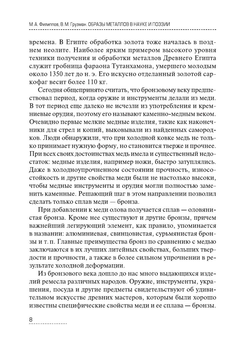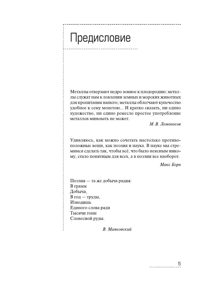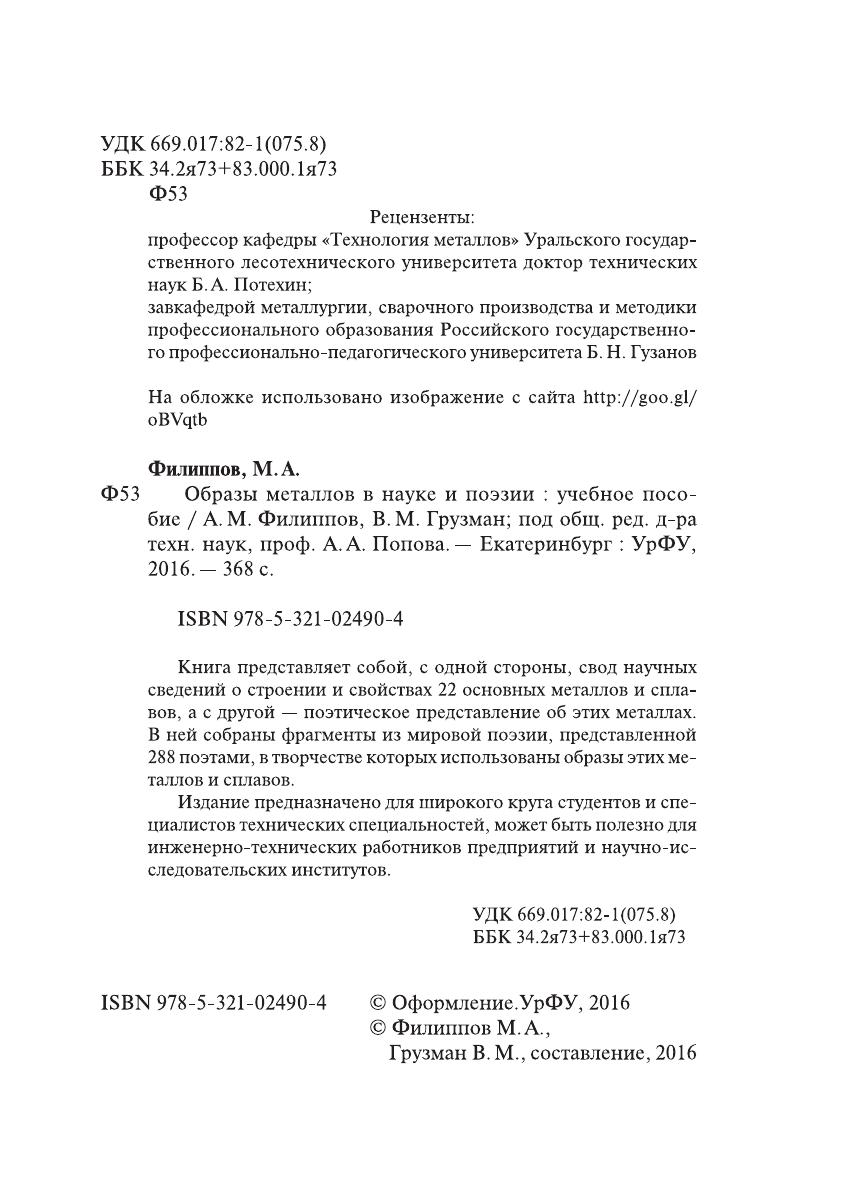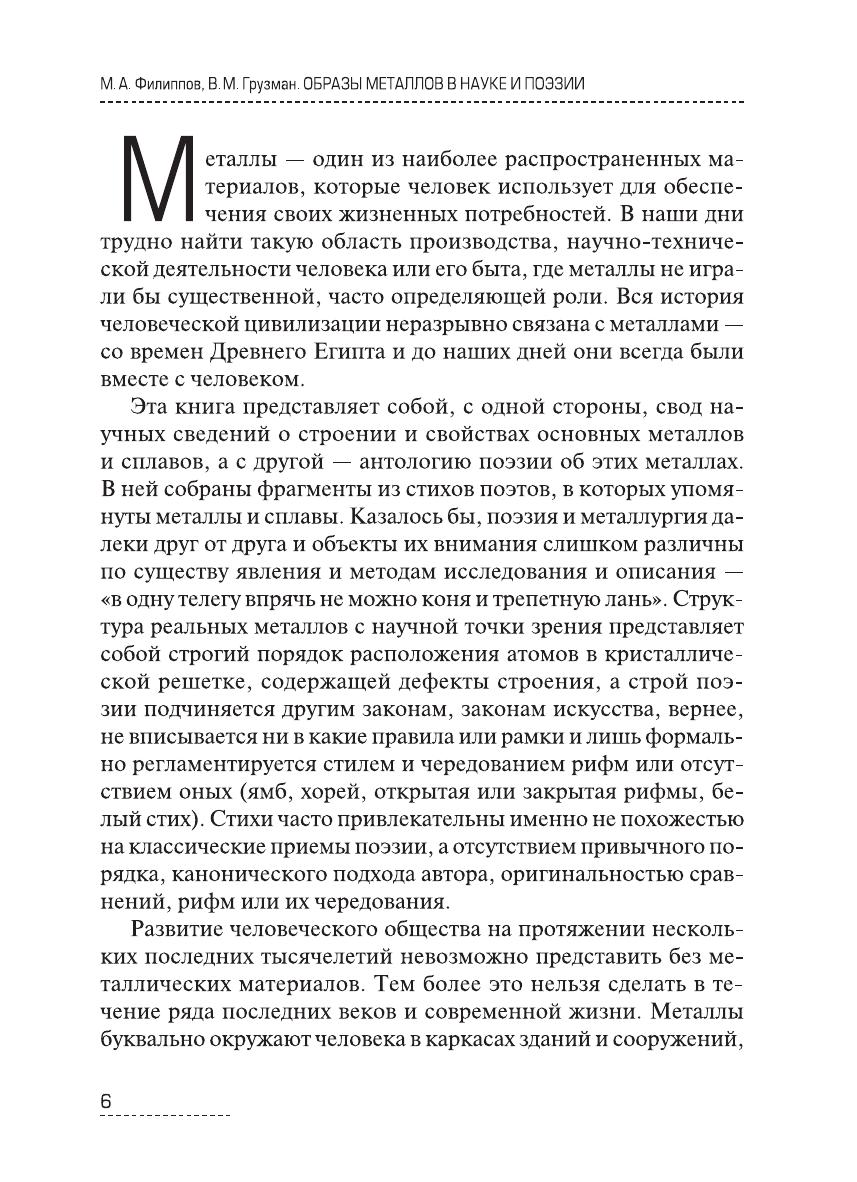 Книга представляет собой, с одной стороны, свод научных сведений о строении и свойствах 22 основных металлов и сплавов, а с другой — поэтическое представление об этих металлах. В ней собраны фрагменты из мировой поэзии, представленной 288 поэтами, в творчестве которых использованы образы этих металлов и сплавов. Издание предназначено для широкого круга студентов и специалистов технических специальностей, может быть полезно для инженерно-технических работников предприятий и научно-исследовательских институтов.