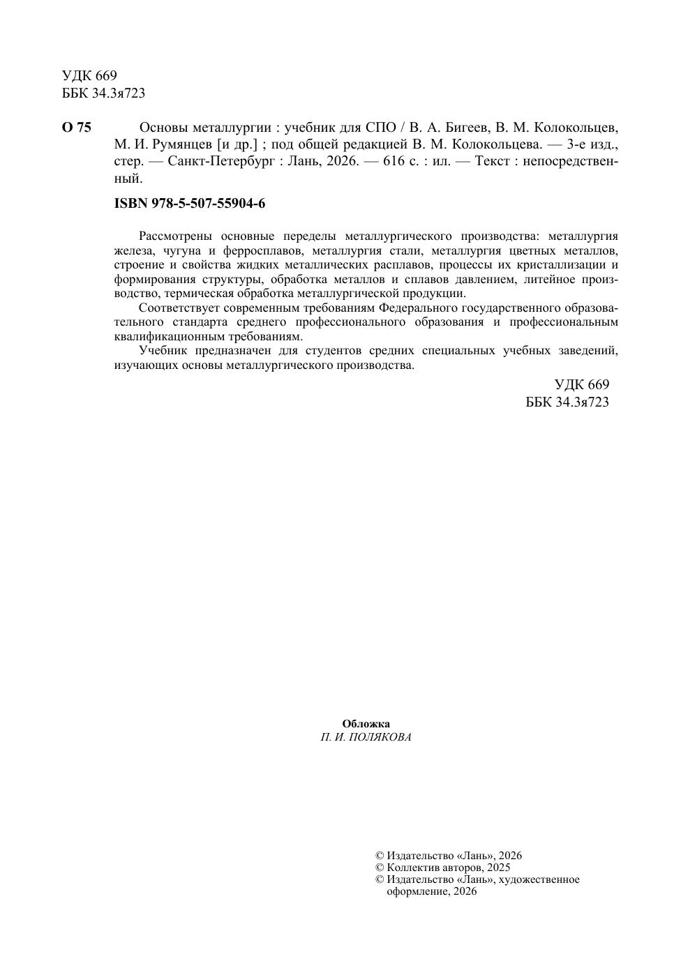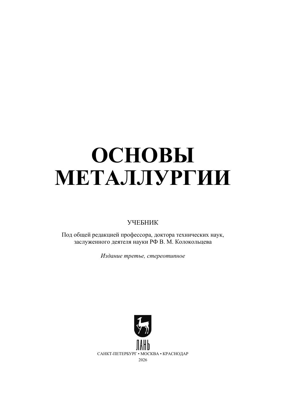 Рассмотрены основные переделы металлургического производства: металлургия железа, чугуна и ферросплавов, металлургия стали, металлургия цветных металлов, строение и свойства жидких металлических расплавов, процессы их кристаллизации и формирования структуры, обработка металлов и сплавов давлением, литейное производство, термическая обработка металлургической продукции. Соответствует современным требованиям Федерального государственного образовательного стандарта среднего профессионального образования и профессиональным квалификационным требованиям. Учебник предназначен для студентов средних специальных учебных заведений, изучающих основы металлургического производства.