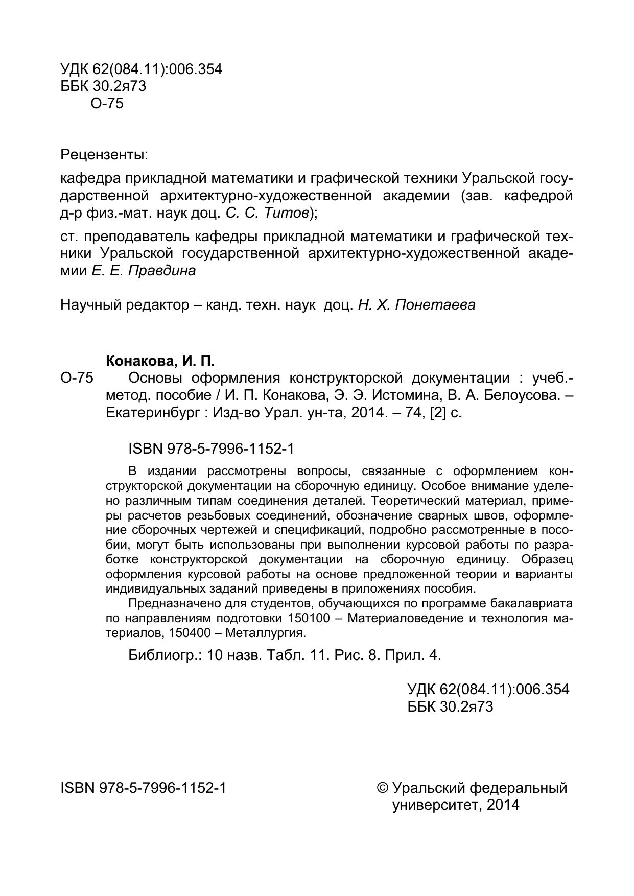 В издании рассмотрены вопросы, связанные с оформлением конструкторской документации на сборочную единицу. Особое внимание уделено различным типам соединения деталей. Теоретический материал, примеры расчетов резьбовых соединений, обозначение сварных швов, оформление сборочных чертежей и спецификаций, подробно рассмотренные в пособии, могут быть использованы при выполнении курсовой работы по разработке конструкторской документации на сборочную единицу. Образец оформления курсовой работы на основе предложенной теории и варианты индивидуальных заданий приведены в приложениях пособия. Предназначено для студентов, обучающихся по программе бакалавриата по направлениям подготовки 150100 – Материаловедение и технология материалов, 150400 – Металлургия.