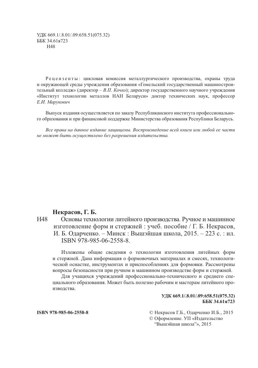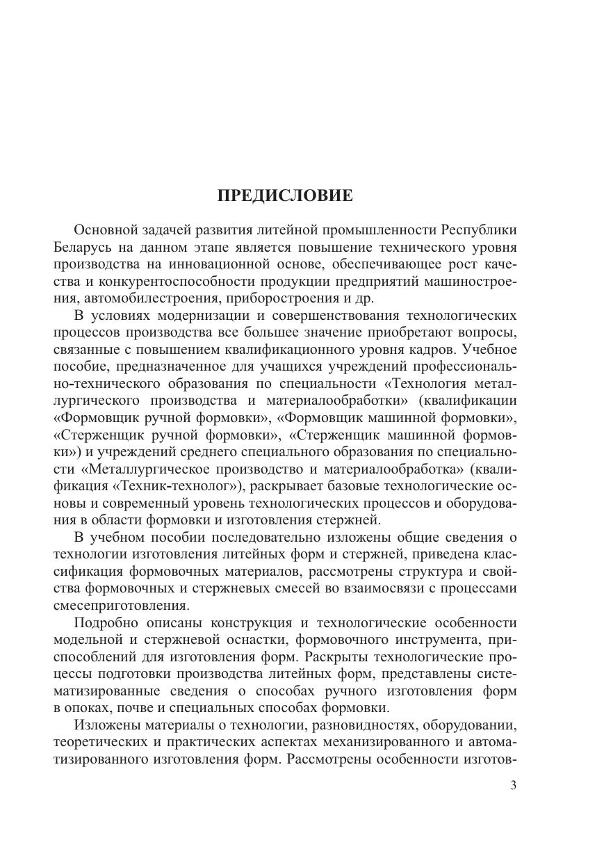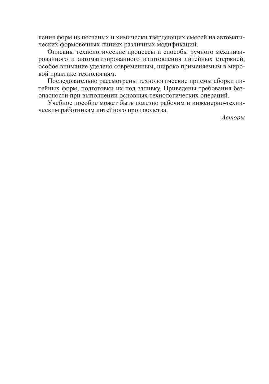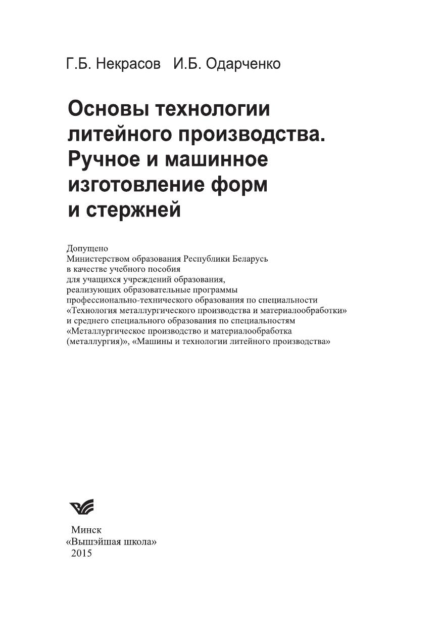 Изложены общие сведения о технологии изготовления литейных форм и стержней. Дана информация о формовочных материалах и смесях, технологической оснастке, инструментах и приспособлениях для формовки. Рассмотрены вопросы безопасности при ручном и машинном производстве форм и стержней. Для учащихся ПТО и ССУЗов. Может быть полезно рабочим и мастерам литейного производства.